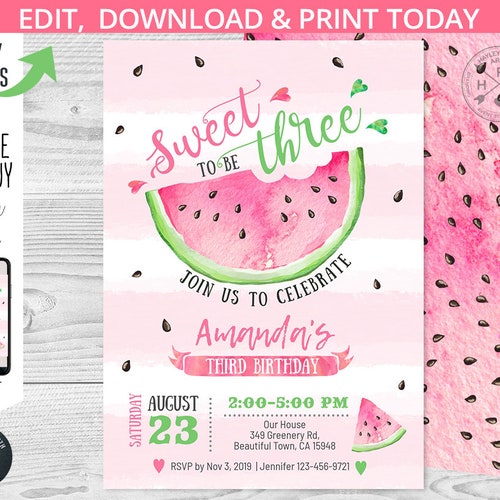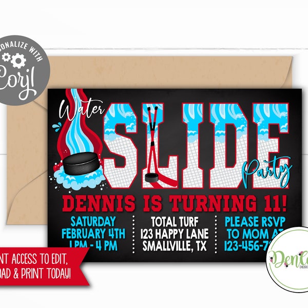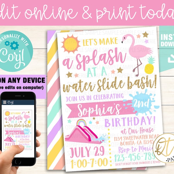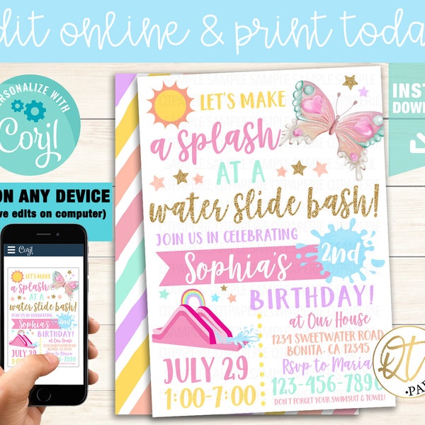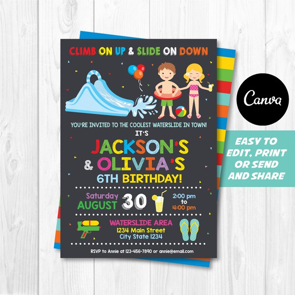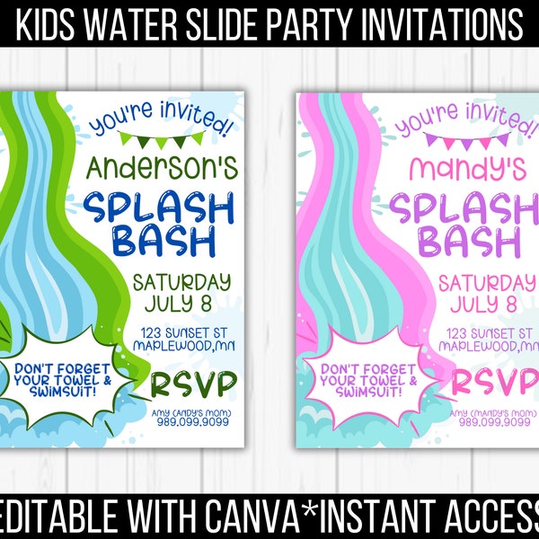 Editable Water Slide Birthday Splash Party Invitation Boy Girl Slide