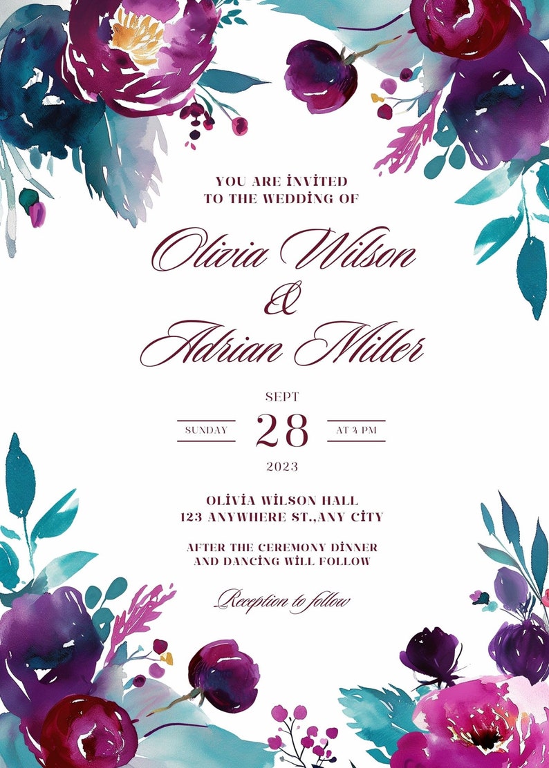 Luxury Teal Deep Purple Floral Wedding Invite Customizable 5x7