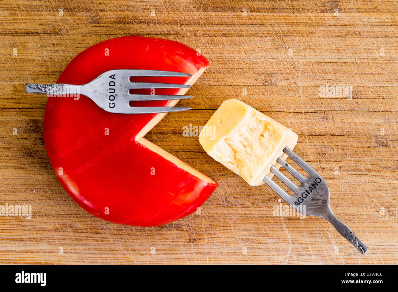 Creative arrangement of wax covered cheese wheel with one quarter cut