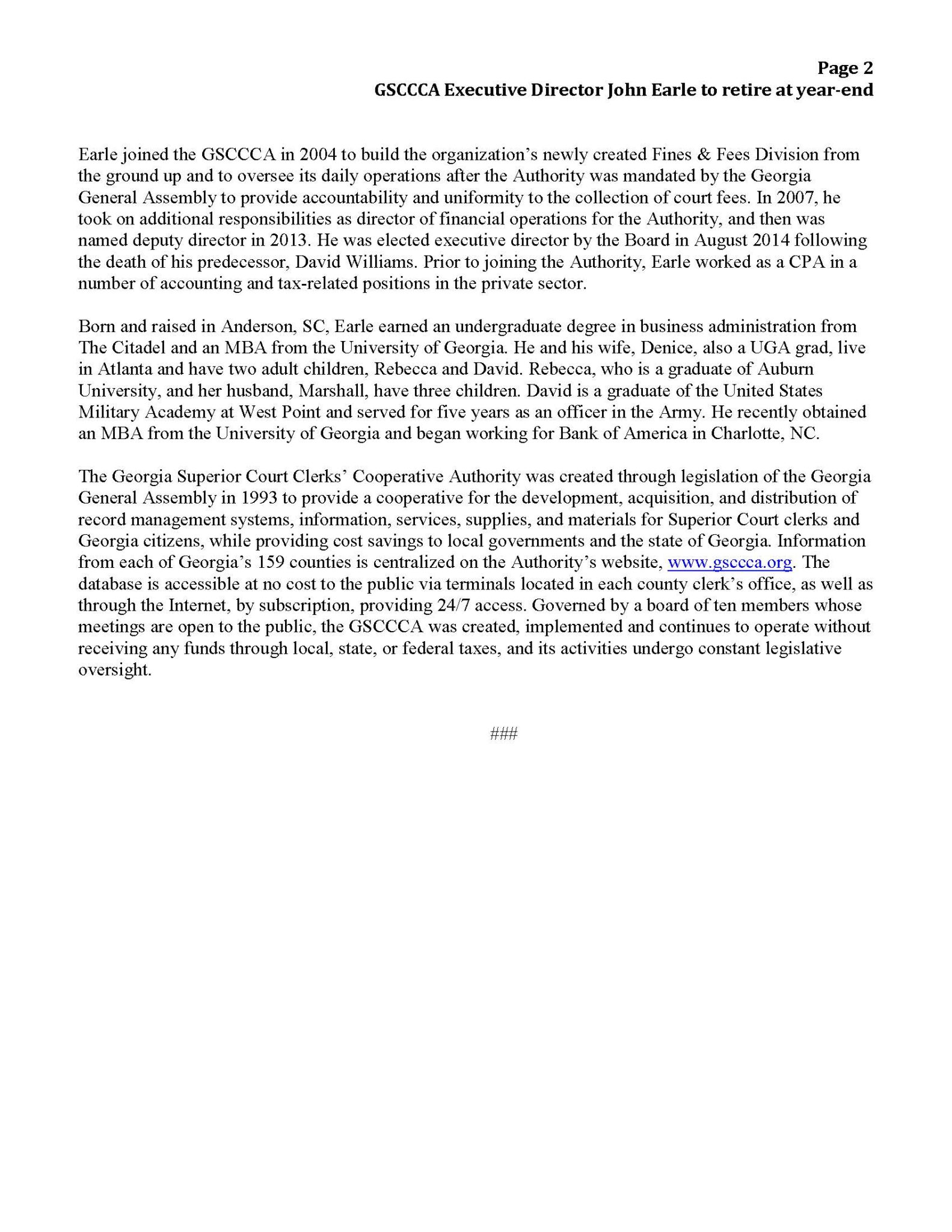 GSCCCA Executive Director John Earle to retire at year end Frances B