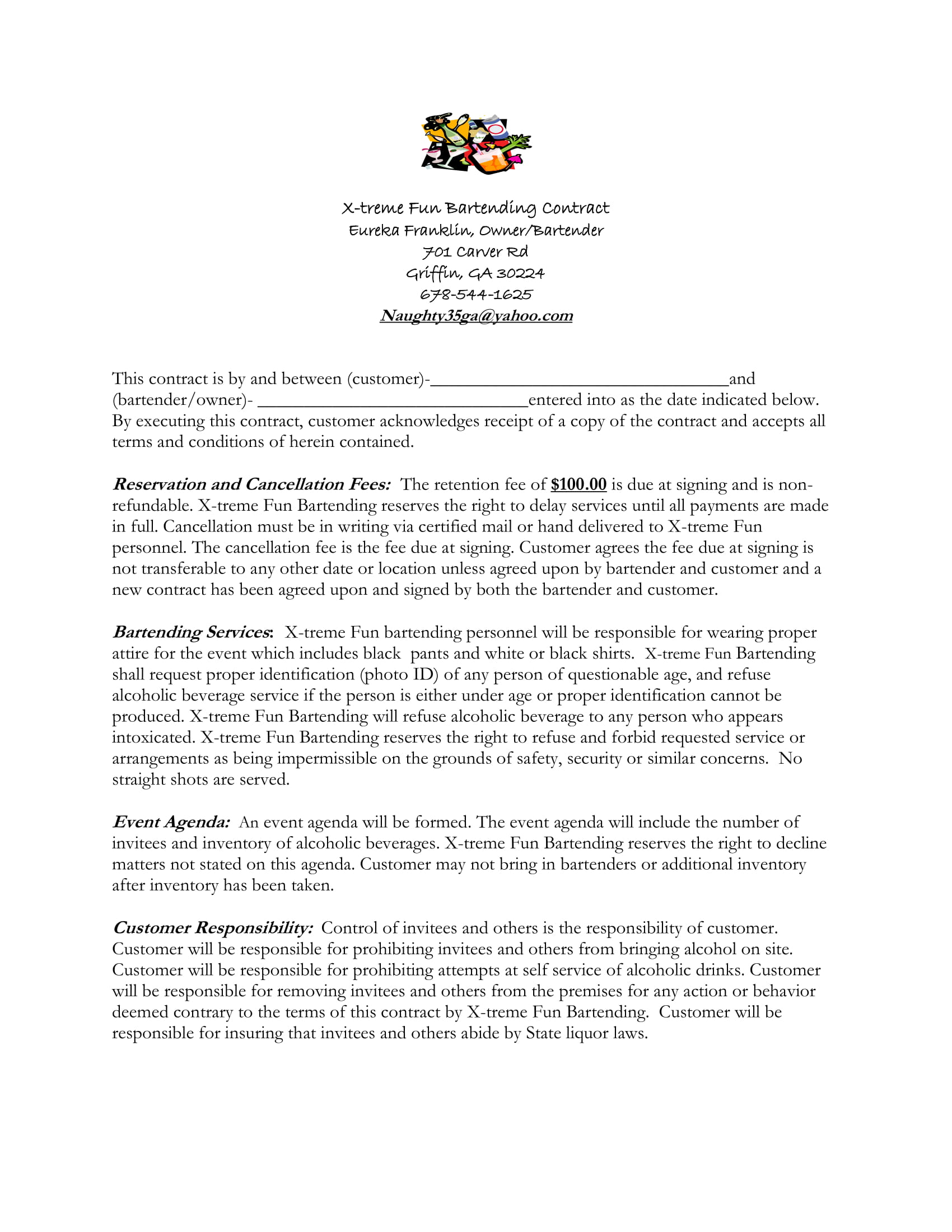 Bartender Contract Template Detailed and Professional Bartending