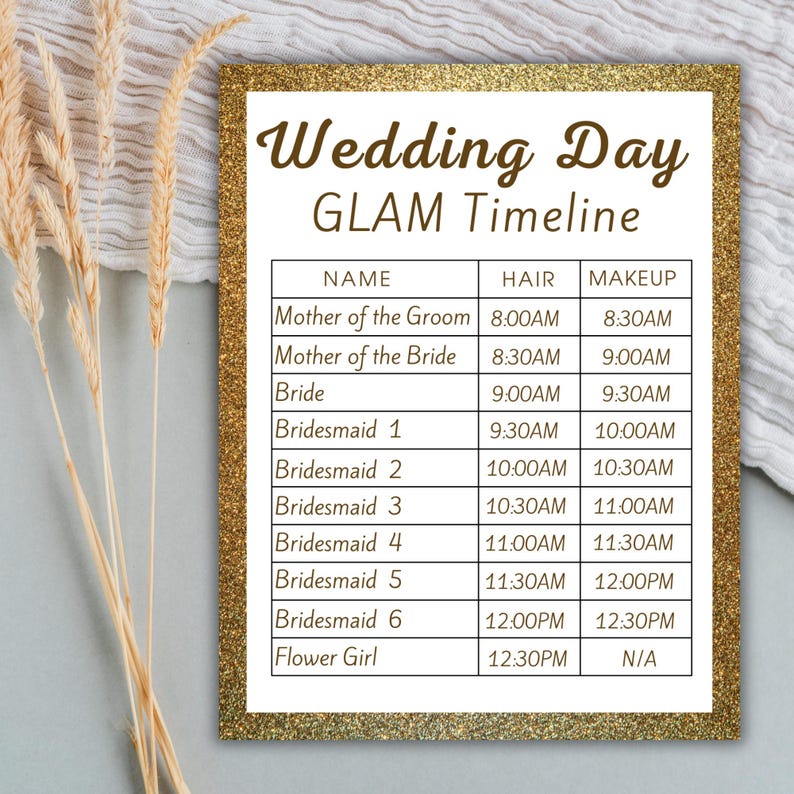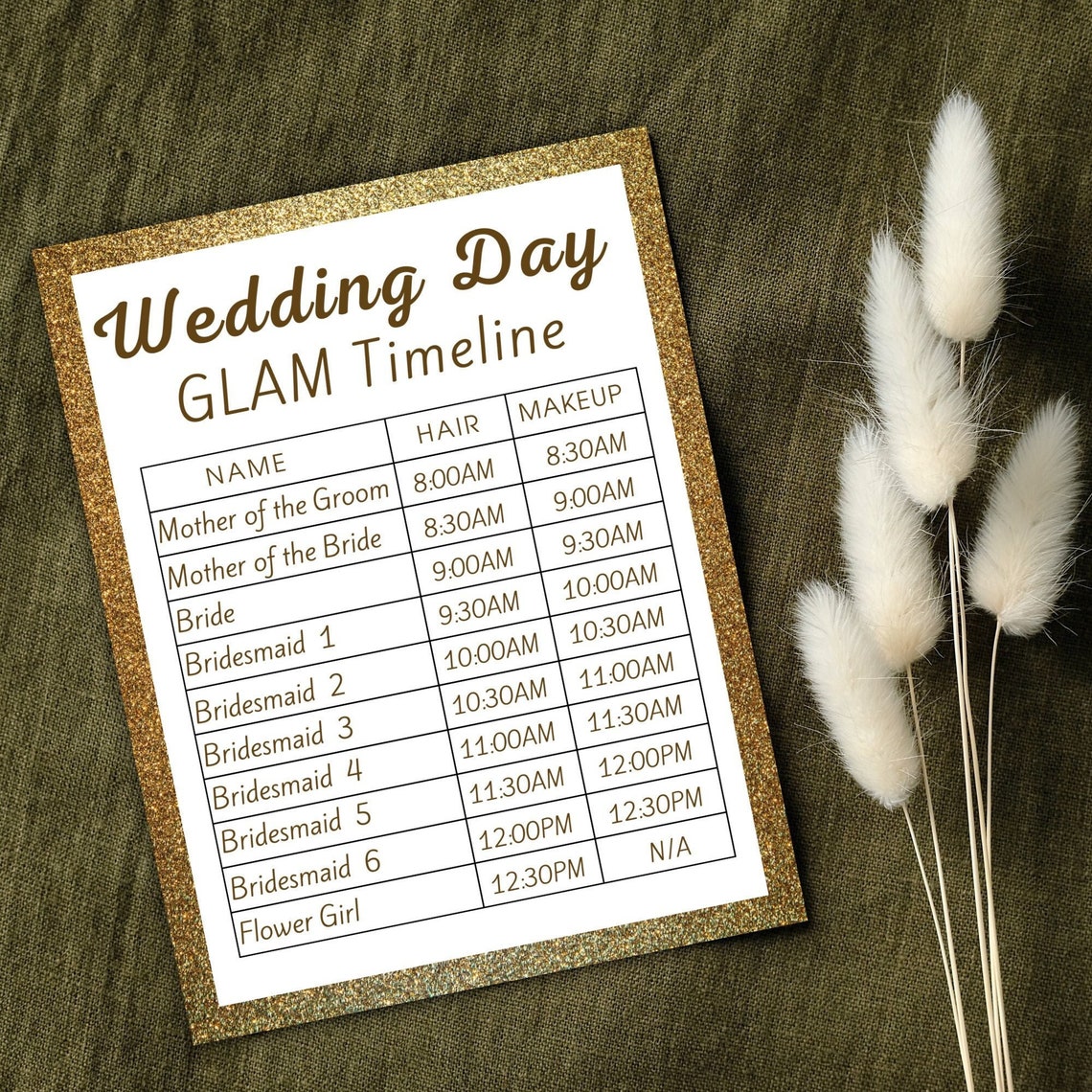 Wedding GLAM Hair and Makeup Timeline Printable Wedding Day Itinerary