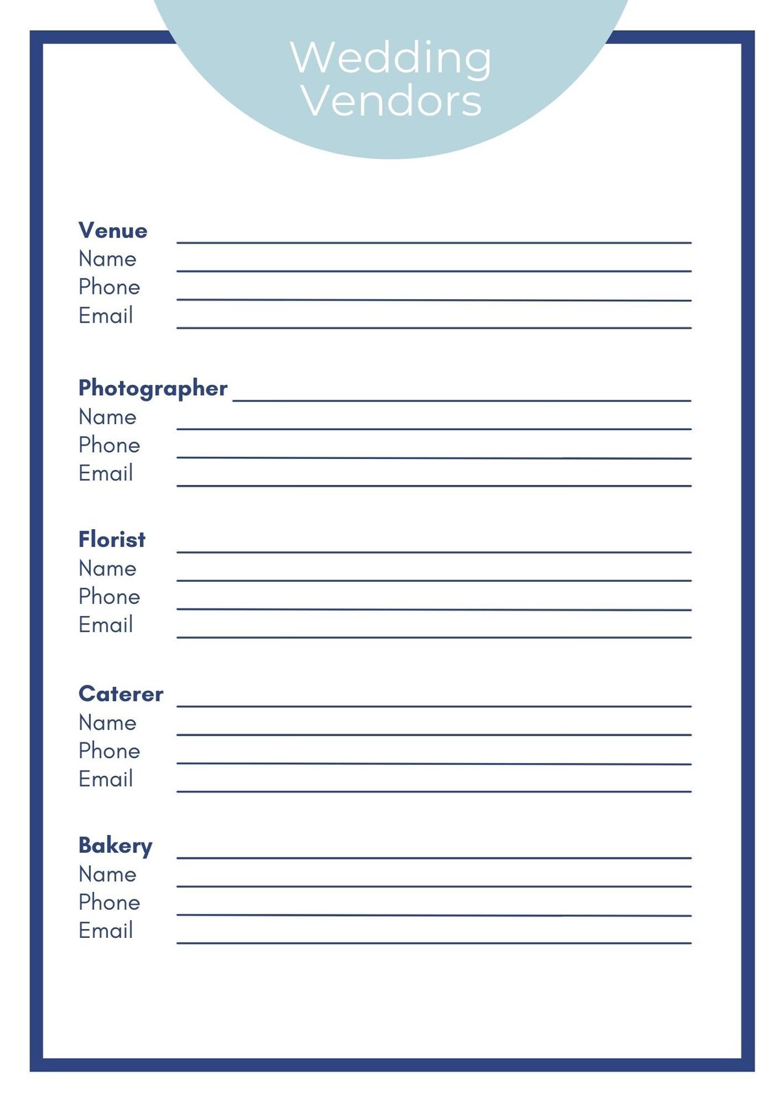 Wedding Vendor Contact Template Etsy