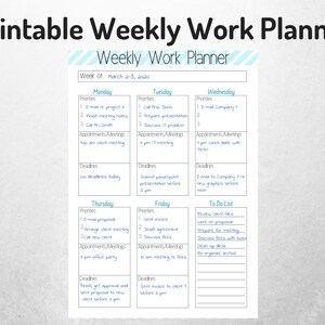 Weekly Work Organizer Weekly Plannerprintable Work Planner Etsy