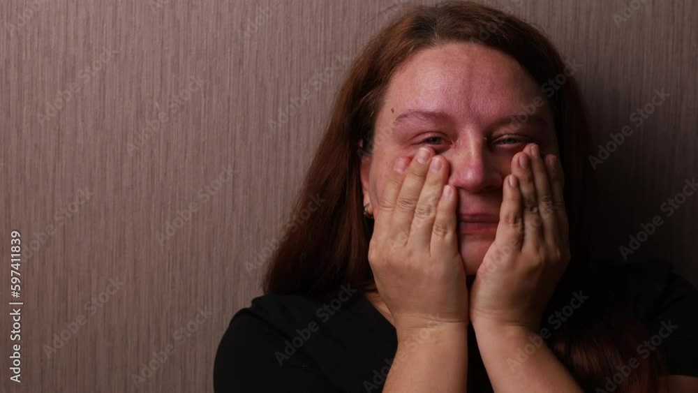 Broken woman hysterically cry and scream grabbing head near room wall