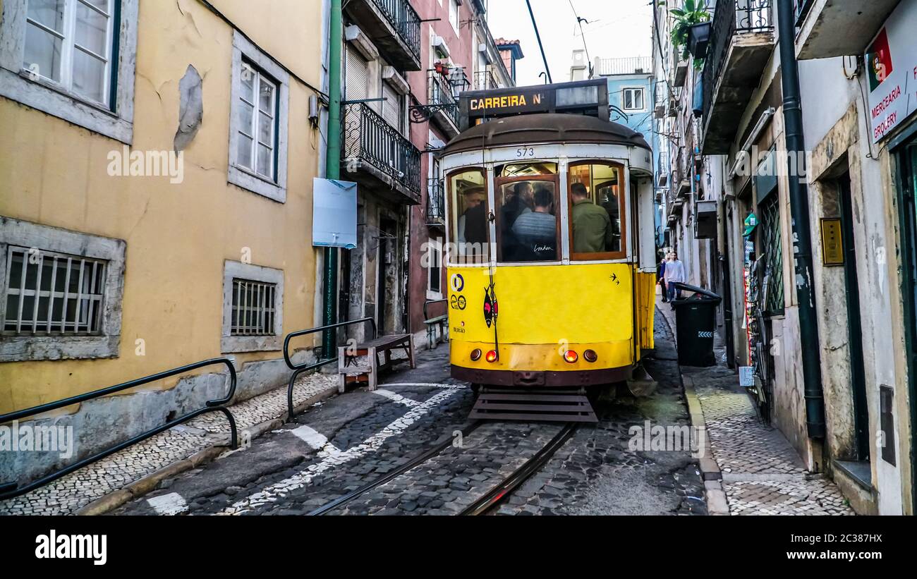 LISBON circa 2017: Old tram passing by in the old town of Lisbon