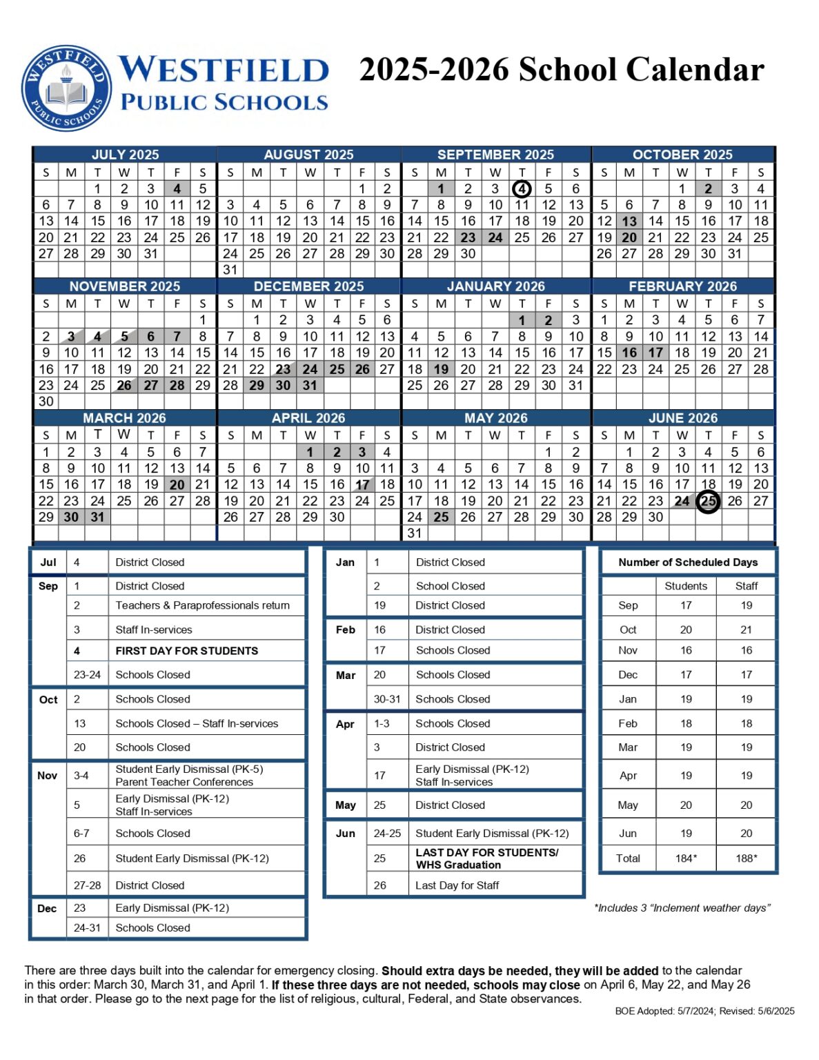 Back To School: Westfield 2025 26 School Calendar Westfield NJ Patch