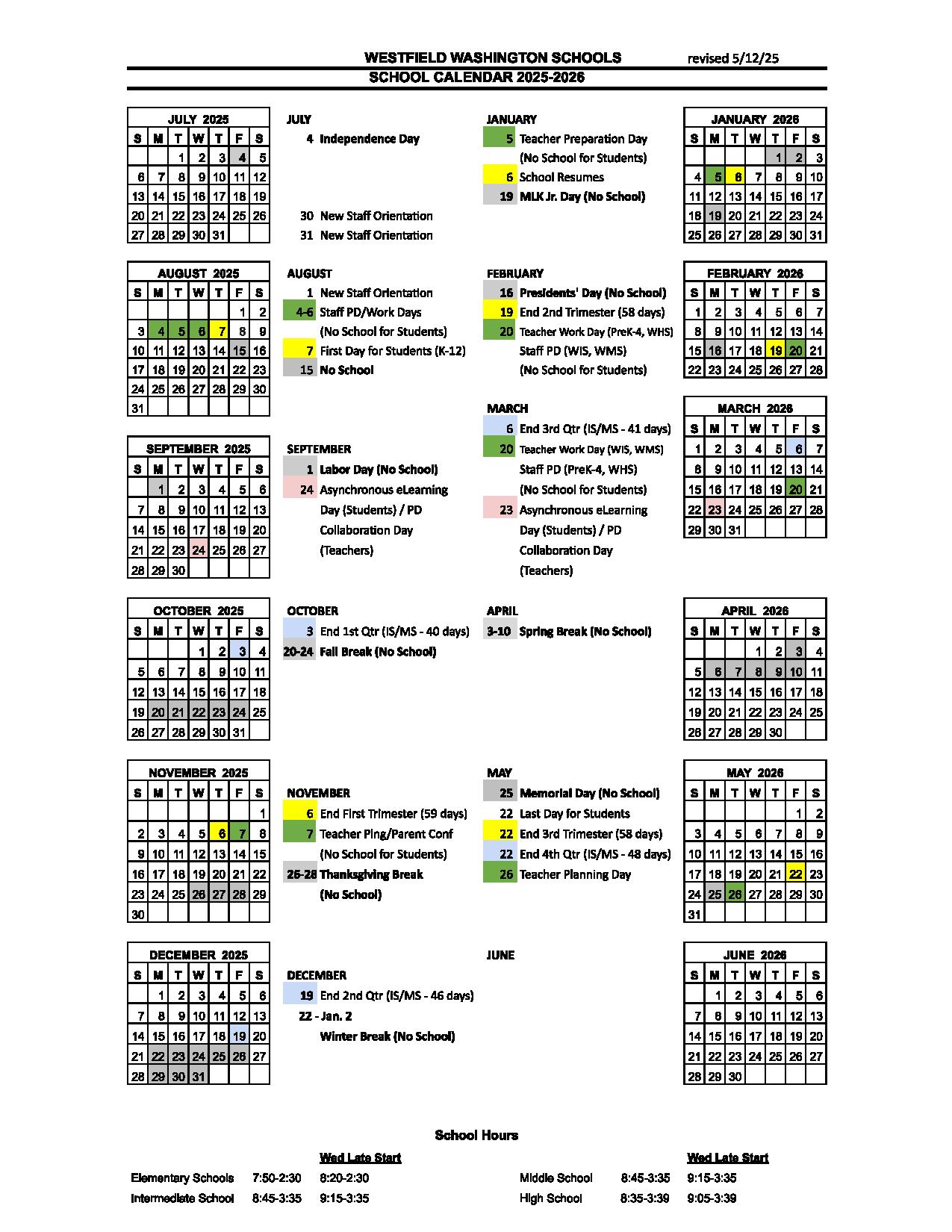 Westfield Washington Schools Calendar 2025 2026 Holidays School