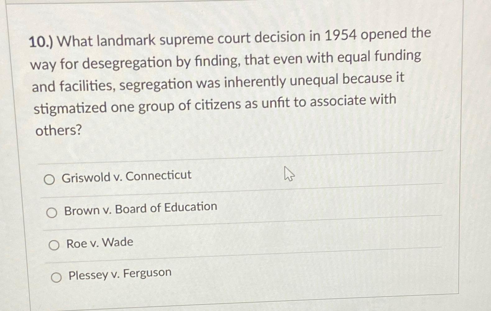 Solved 10 ) What landmark supreme court decision in 1954 Chegg com