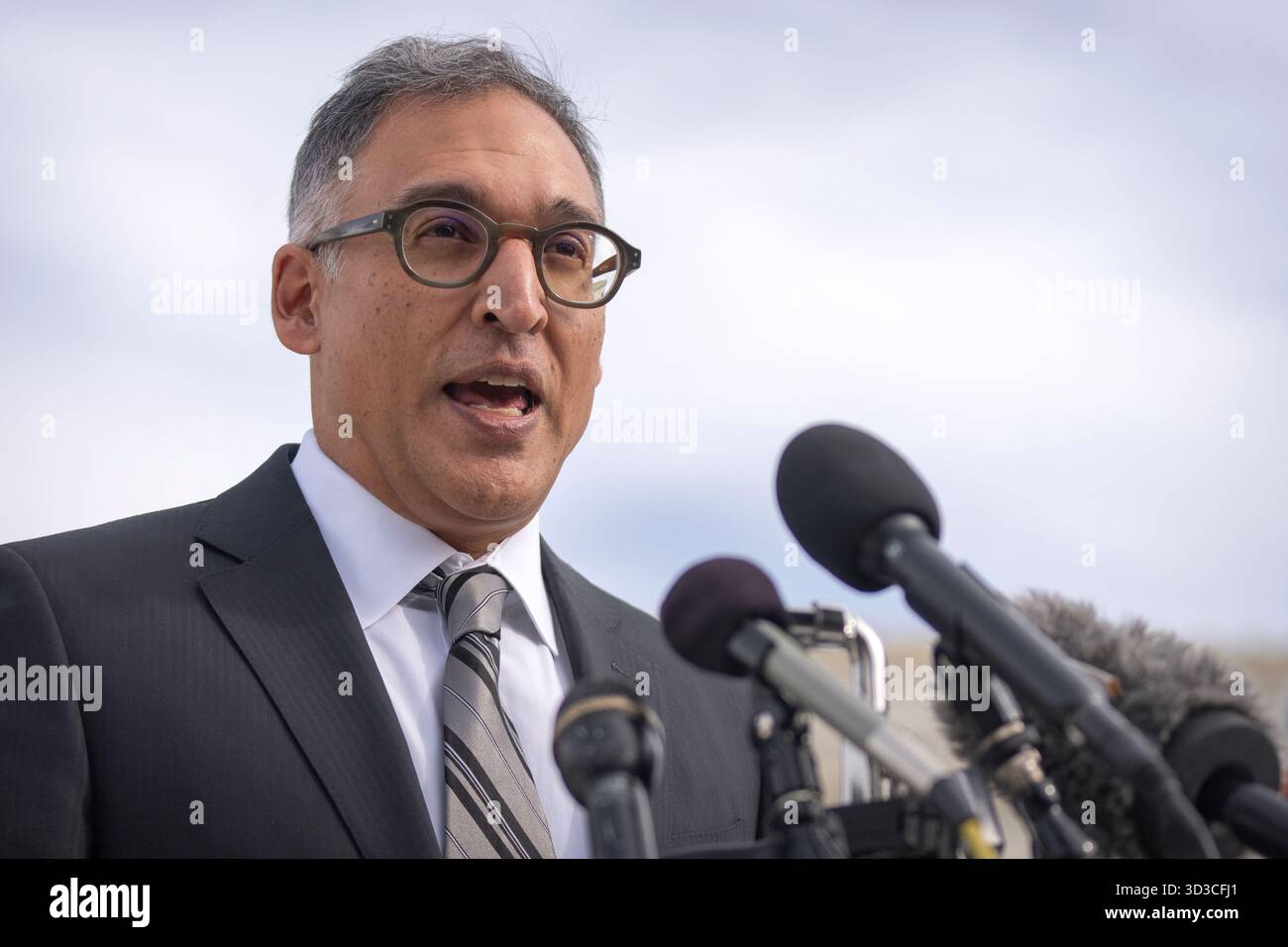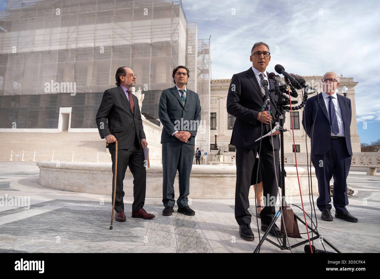 Attorney Neal Katyal speaks to reporters outside the Supreme Court on