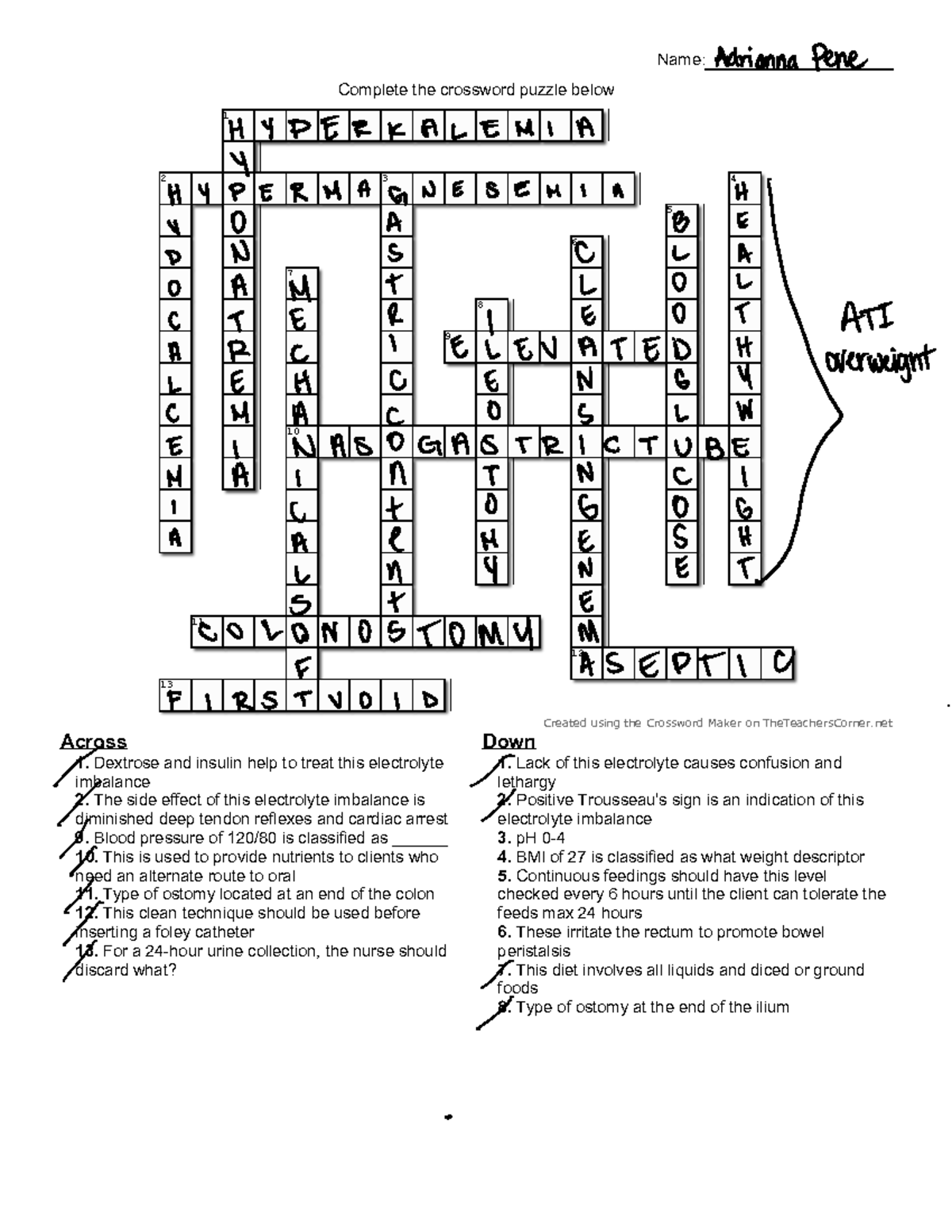 Elimination Nutrition electrolytes Crossword puzzle Down Lack of this