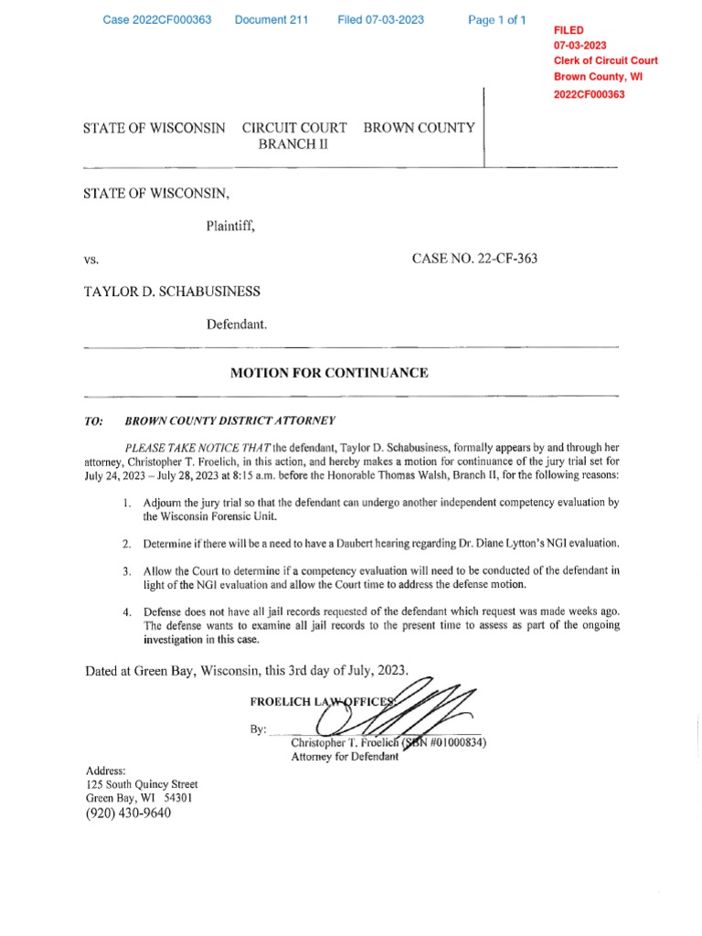 Schabusiness Motion for Continuance PDF Wisconsin Circuit Courts