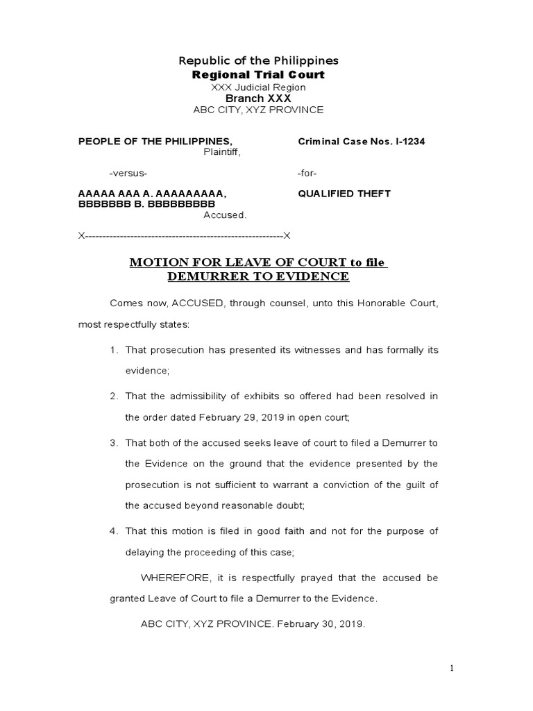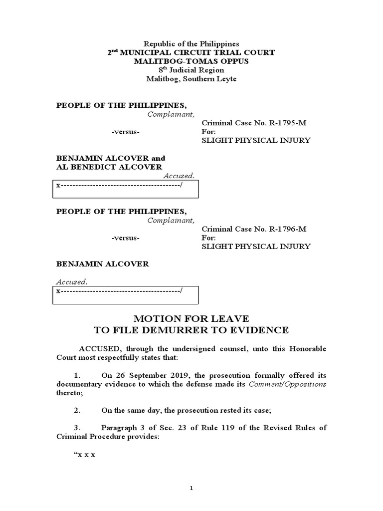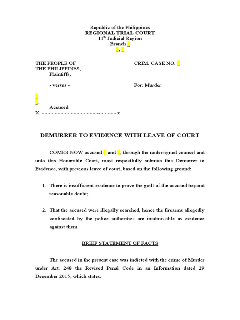 Demurrer To Evidence With Leave of Court Download Free PDF Search