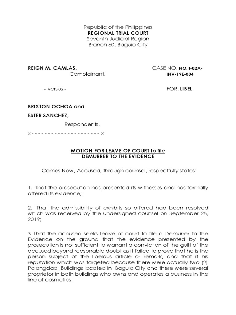 Motion For Leave of Court To File Demurrer To Evidence Libel Download