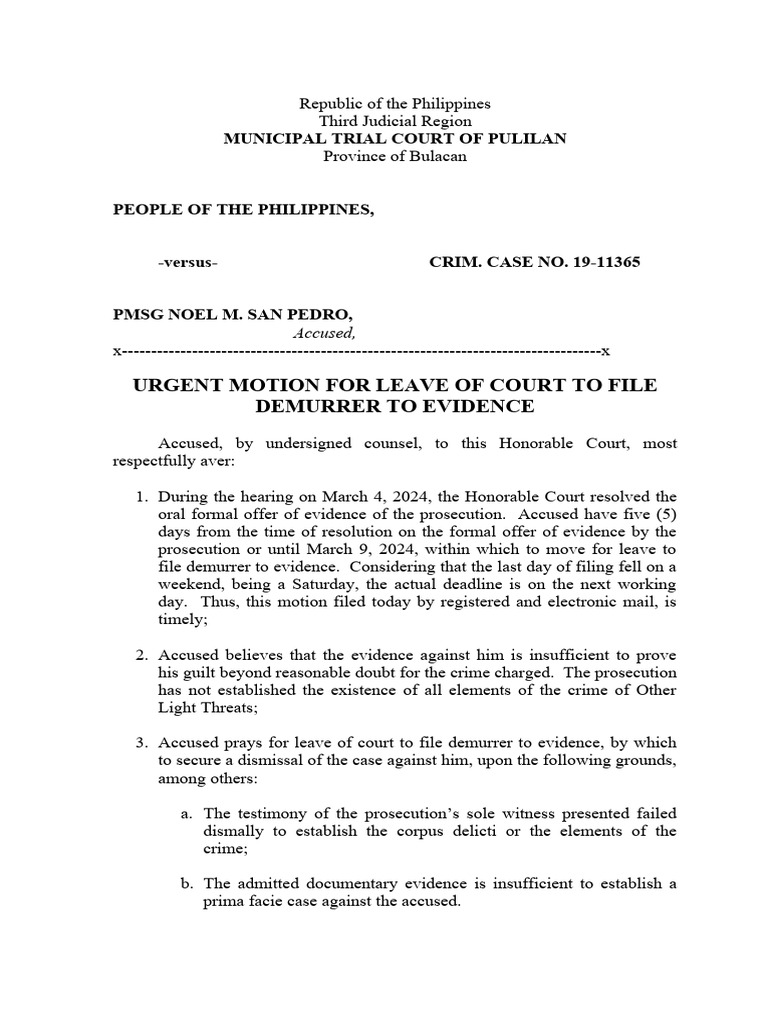 Urgent Motion For Leave of Court To File Demurrer Noel San Pedro PDF