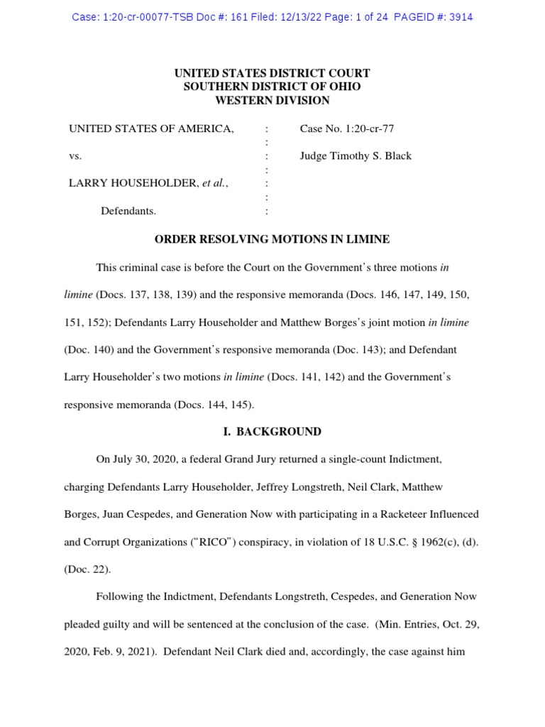 U S District Court Judge Timothy Black Rules On Householder Pretrial