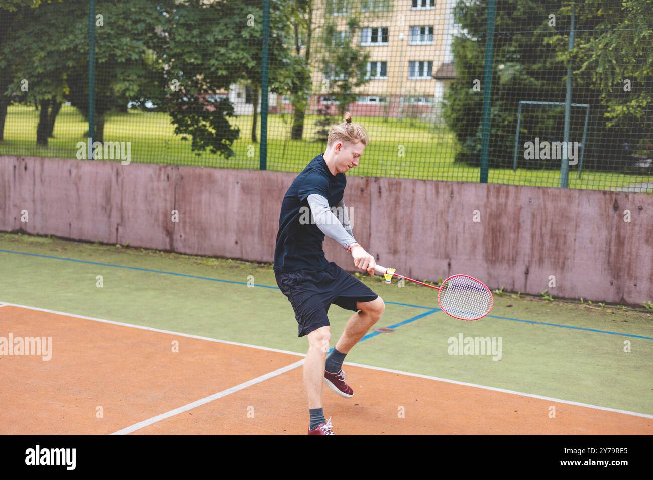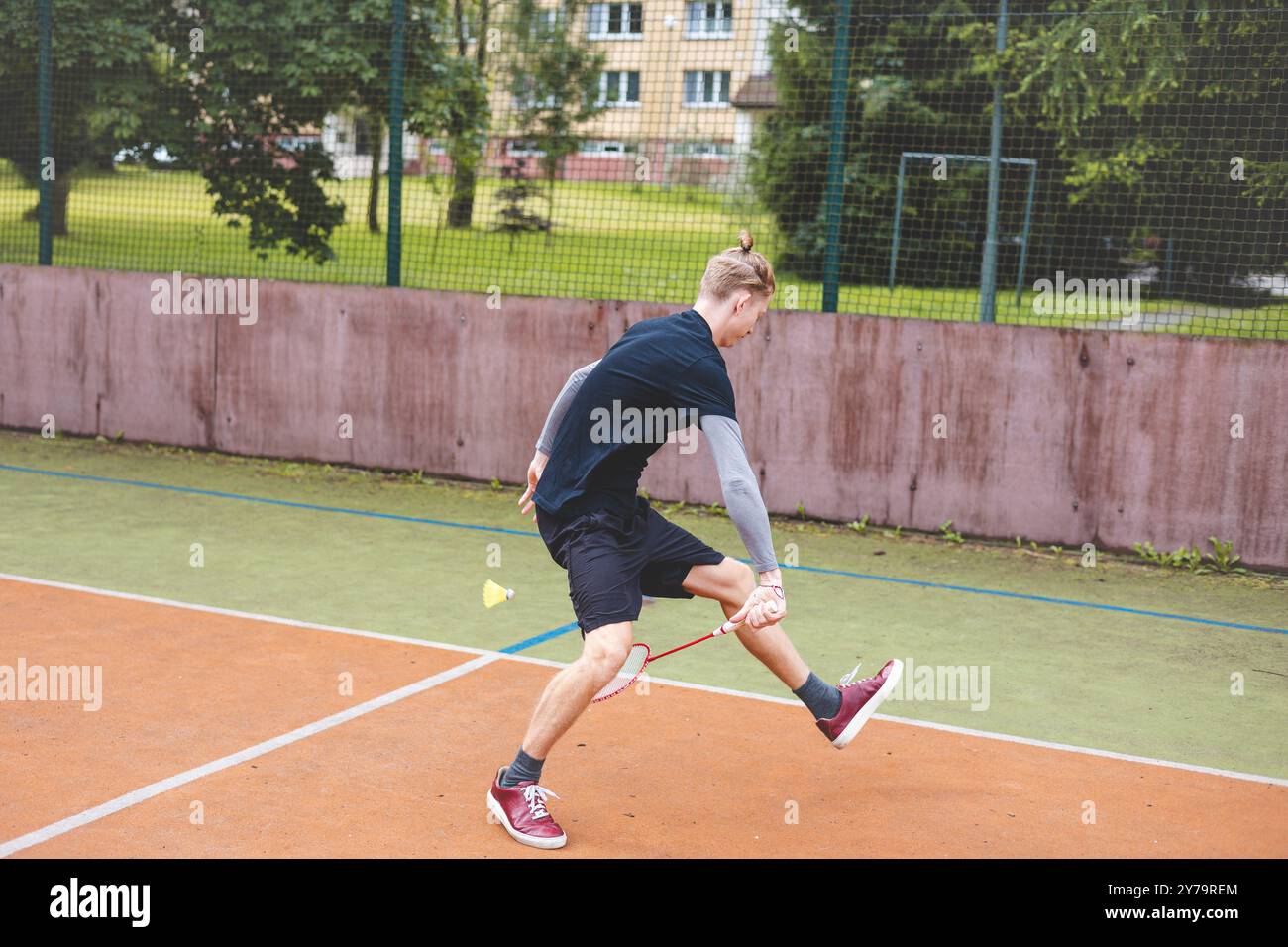 Badminton player makes an agile low return shot on an outdoor court