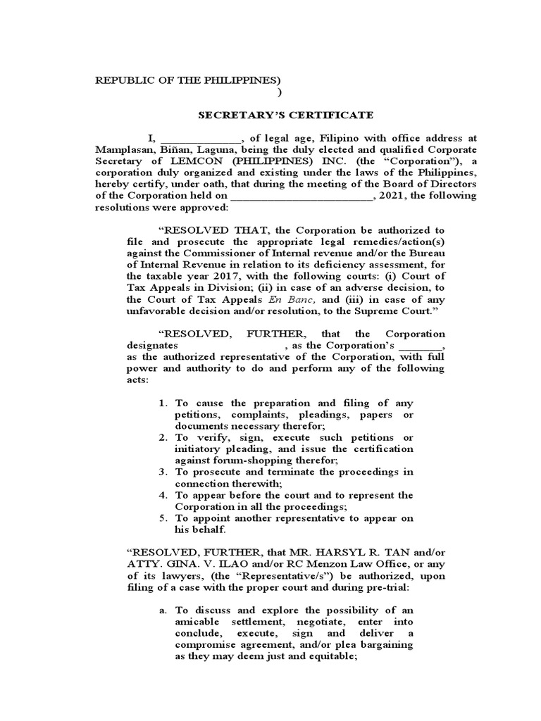 Philippines Secretary #39 s Certificate Form Fill Out Sign Online and