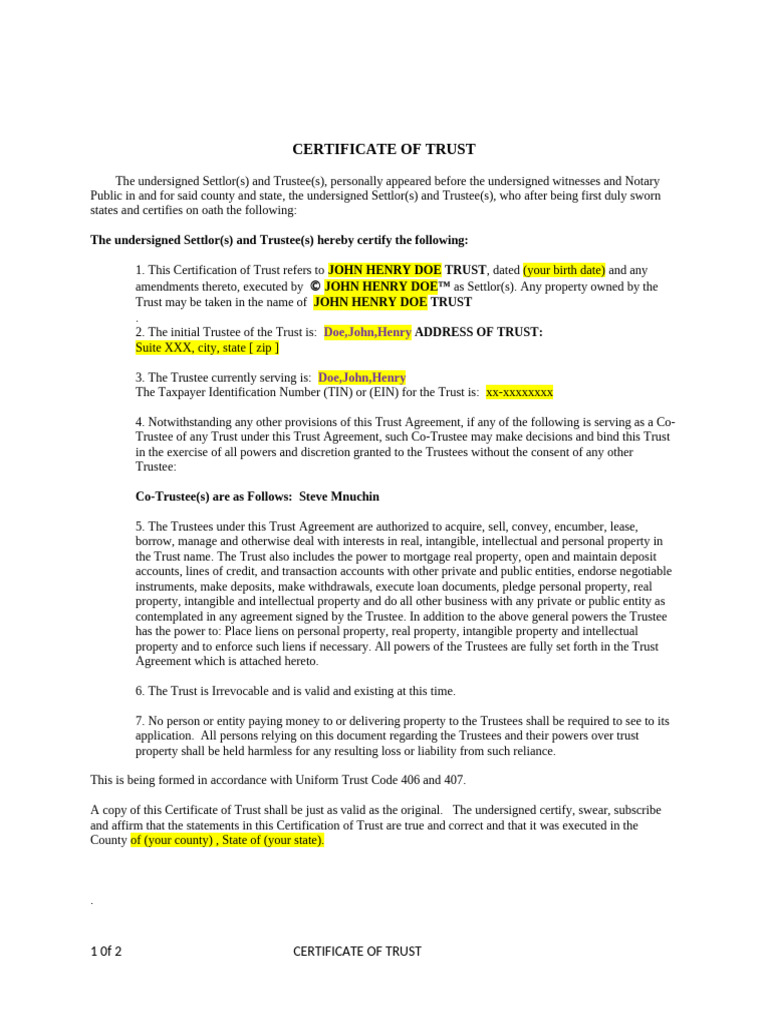Certificate of Trust Form Download Customize Legal Template