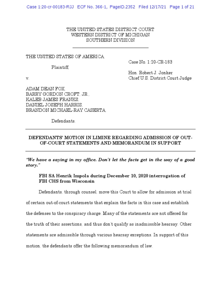 Motion Regarding Admission of Out of Court Statement PDF Hearsay