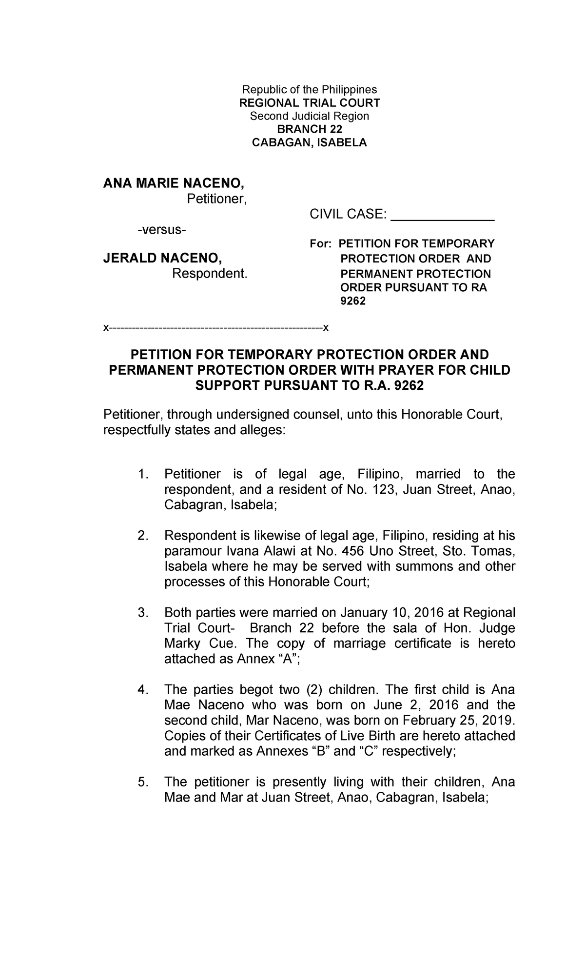 TPO Legal Forms Republic of the Philippines REGIONAL TRIAL COURT