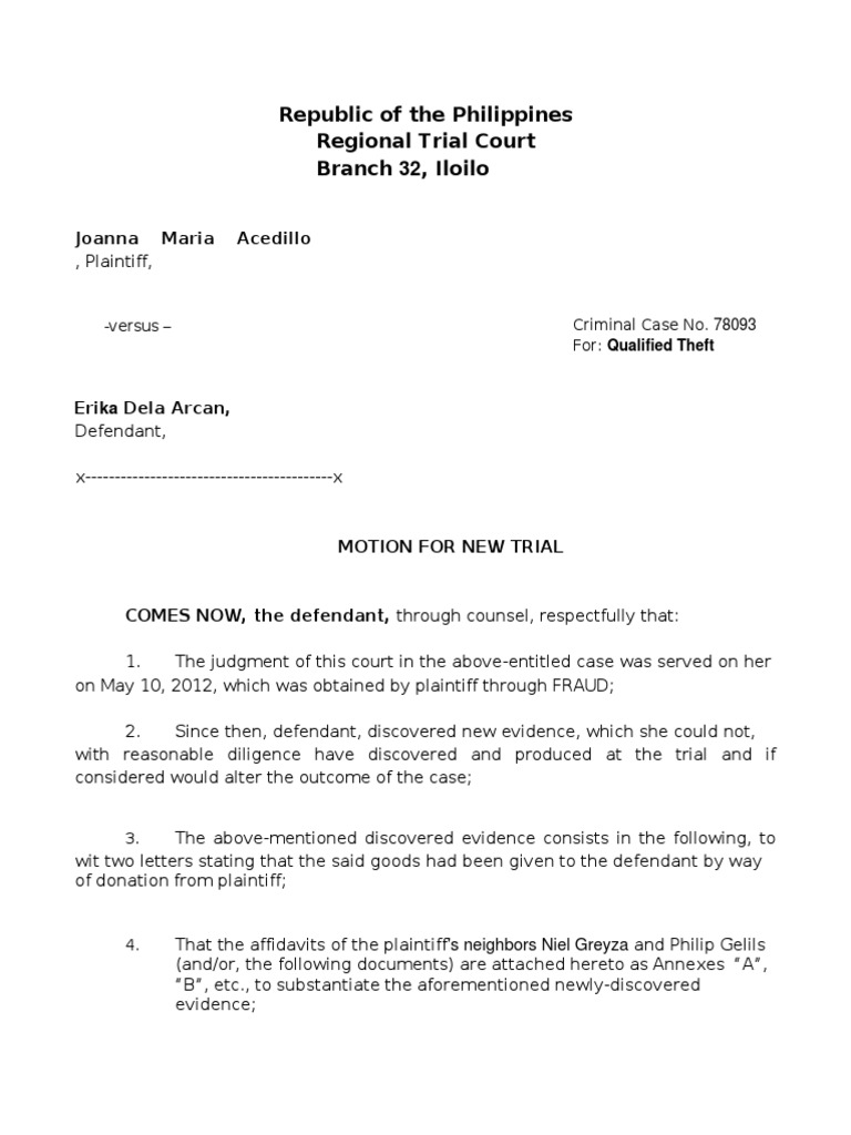 Motion For New Trial (Sample) PDF Virtue Justice