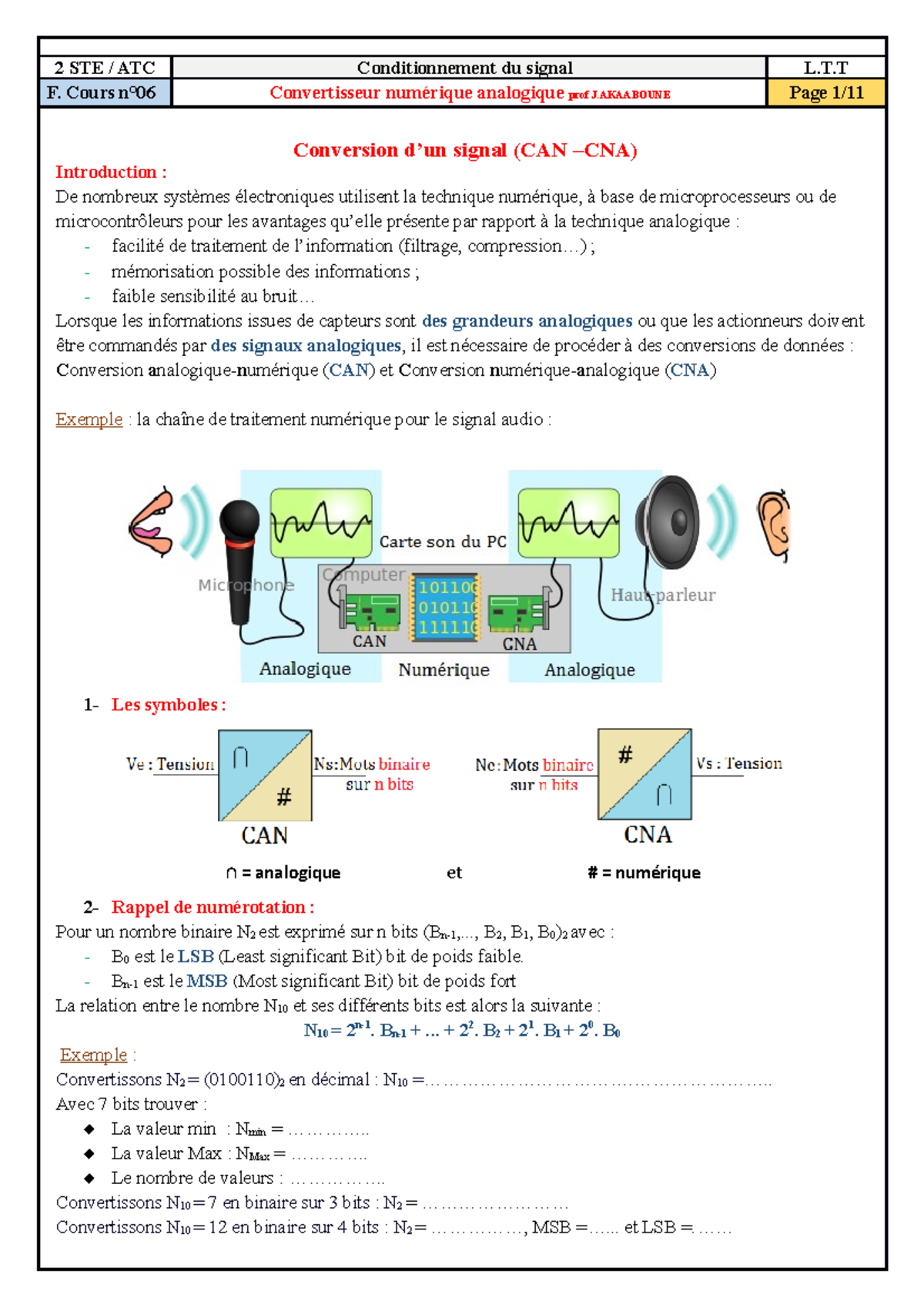 Cours 2STE : Convertisseur Numérique Analogique et Analogique Numérique