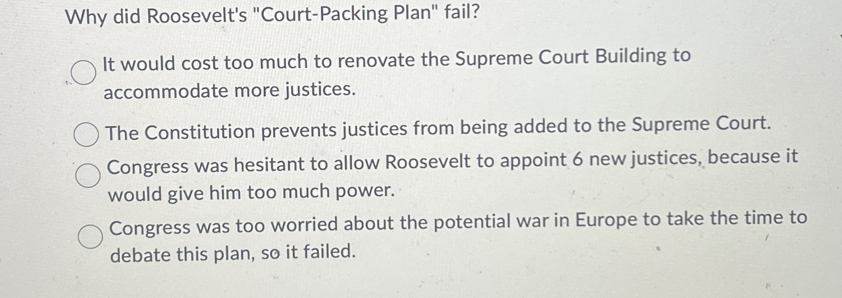 Solved Why did Roosevelt #39 s quot Court Packing Plan quot fail?It Chegg com