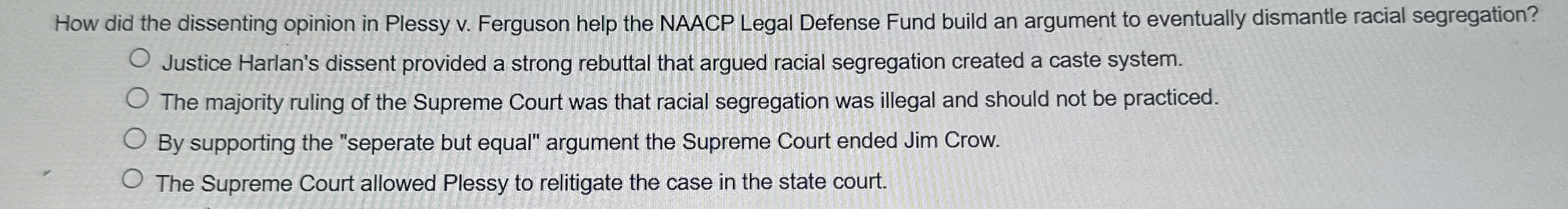 How did the dissenting opinion in Plessy v Ferguson Chegg com