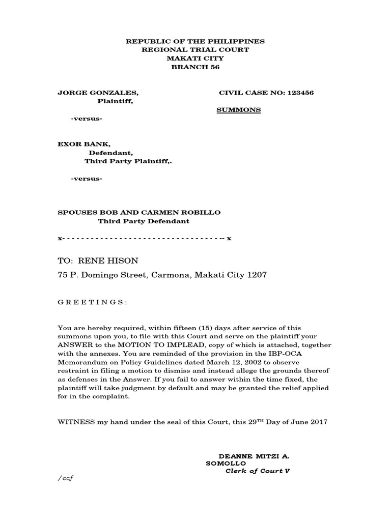 Summons Sample PDF Lawsuit Courts