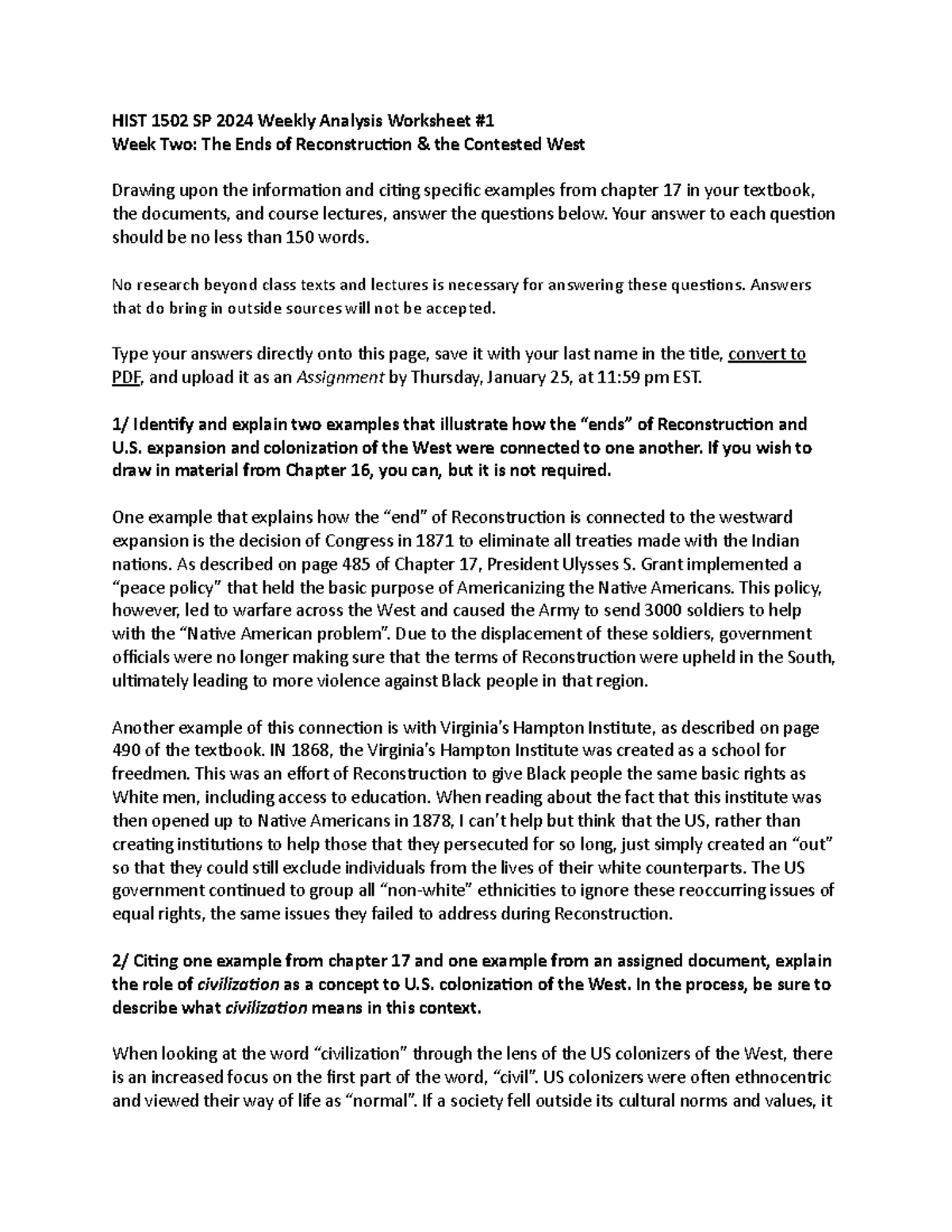 Worksheet 1 Week 2 HIST 1502 SP 24 HIST 1502 SP 2024 Weekly Analysis