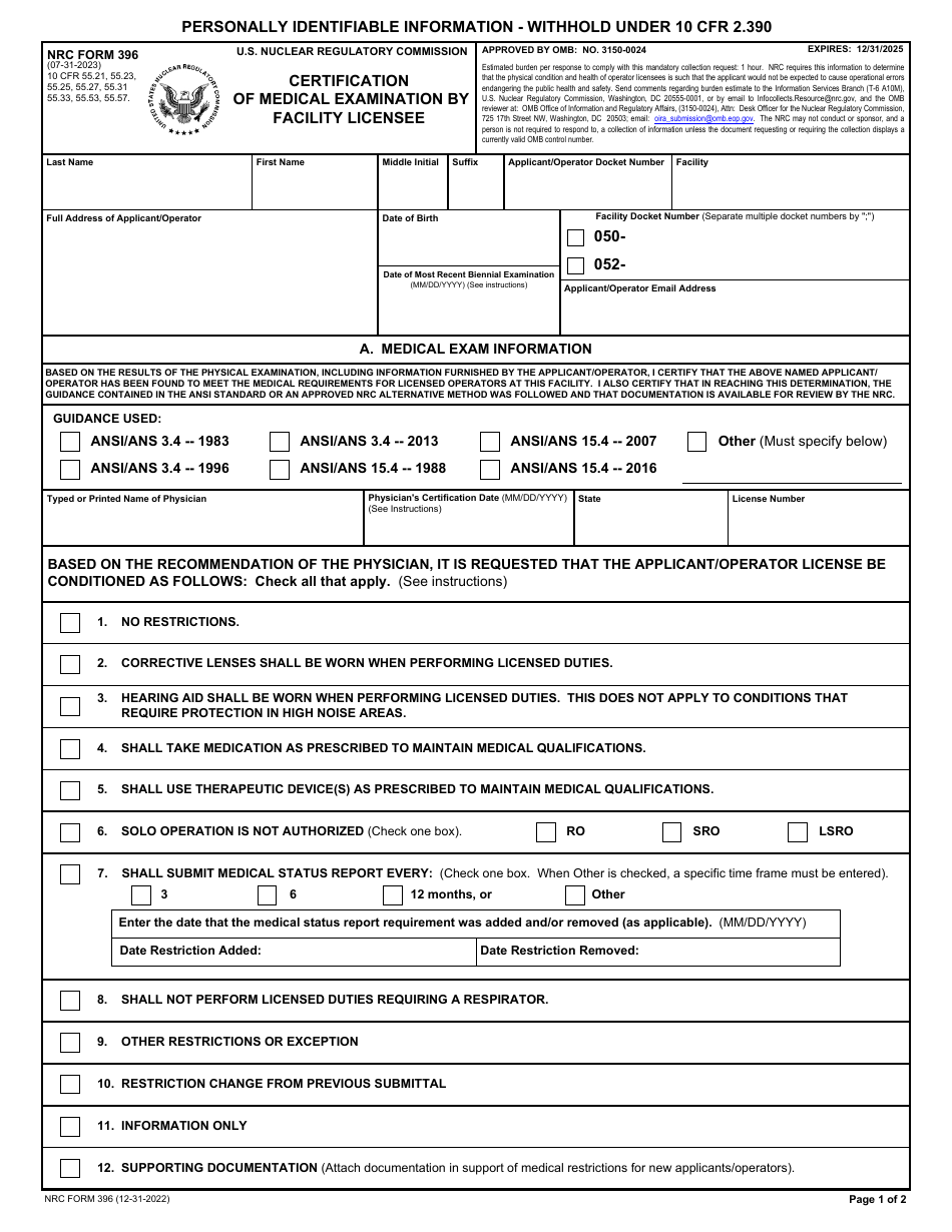 NRC Form 396 Fill Out Sign Online and Download Fillable PDF