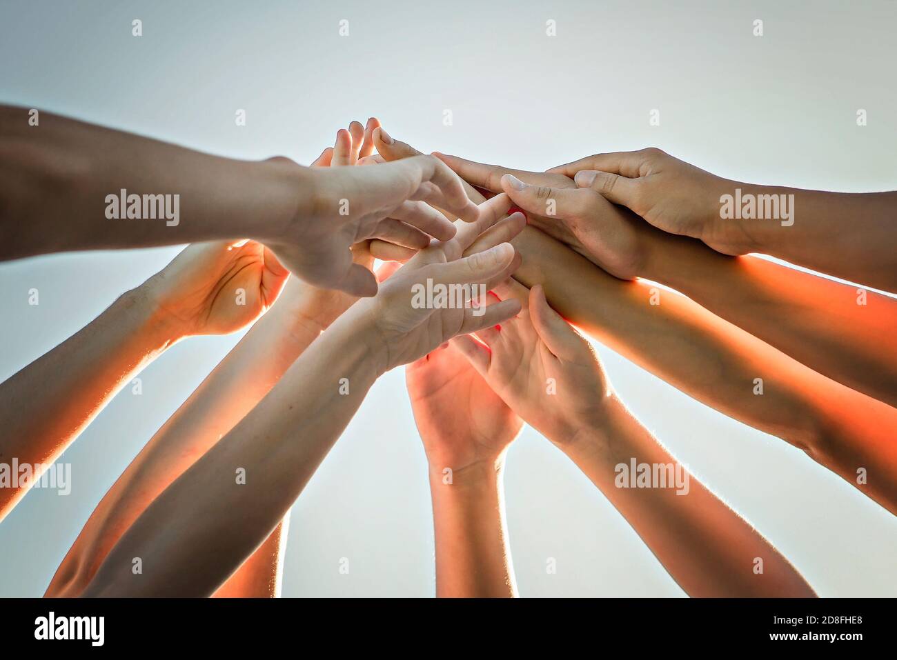 many hands over a nice sky team work Stock Photo Alamy
