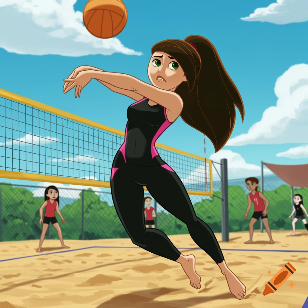 Cartoon girl in a black and pink athletic suit hits a volleyball on a