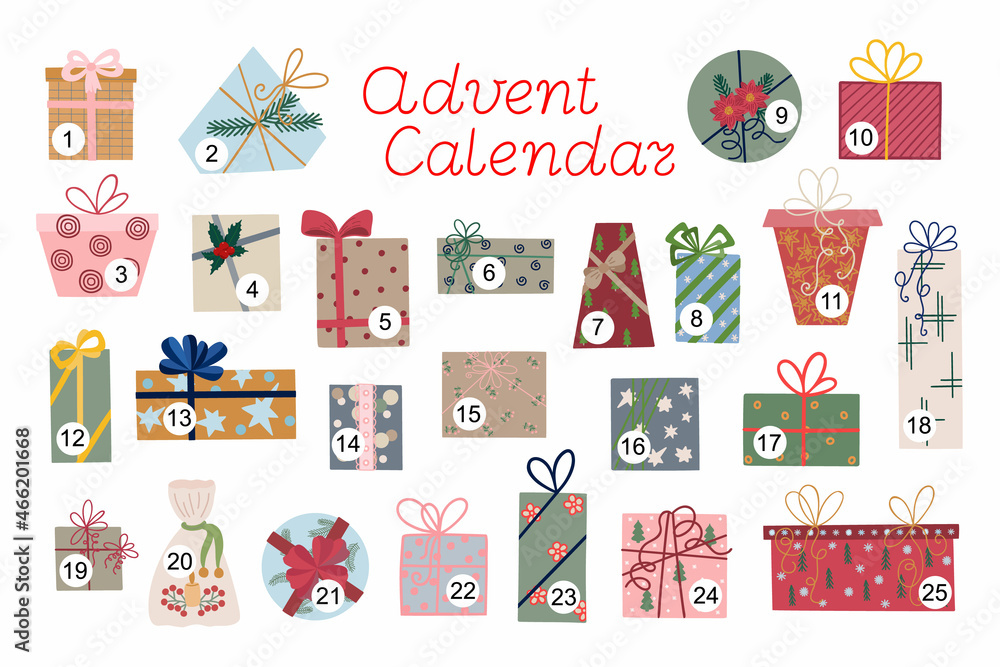 Christmas advent calendar of gift boxes set with ribbon and bows vector