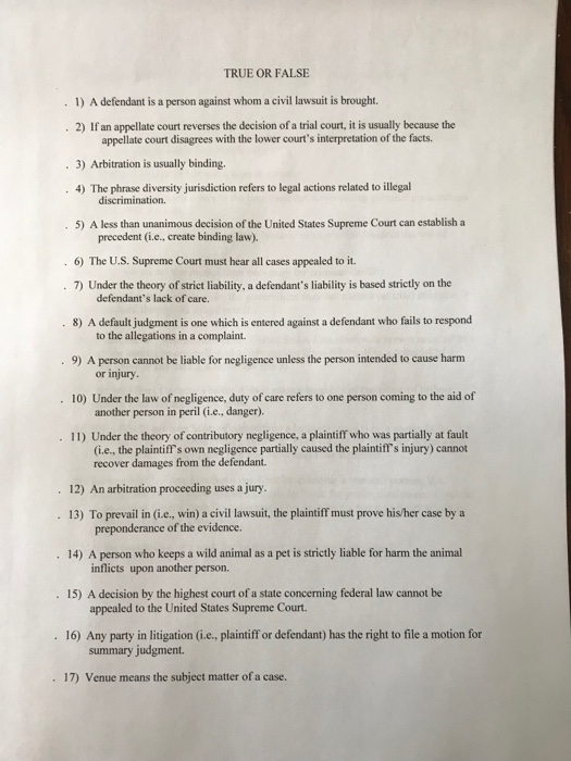 TRUE OR FALSE 1) A defendant is a person against Chegg com