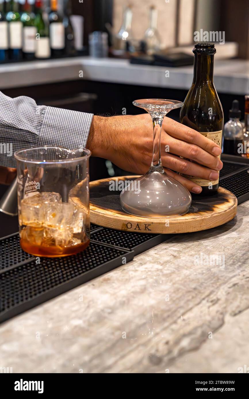 Bartender grabbing a bottle of vermouth and making a smoked whiskey