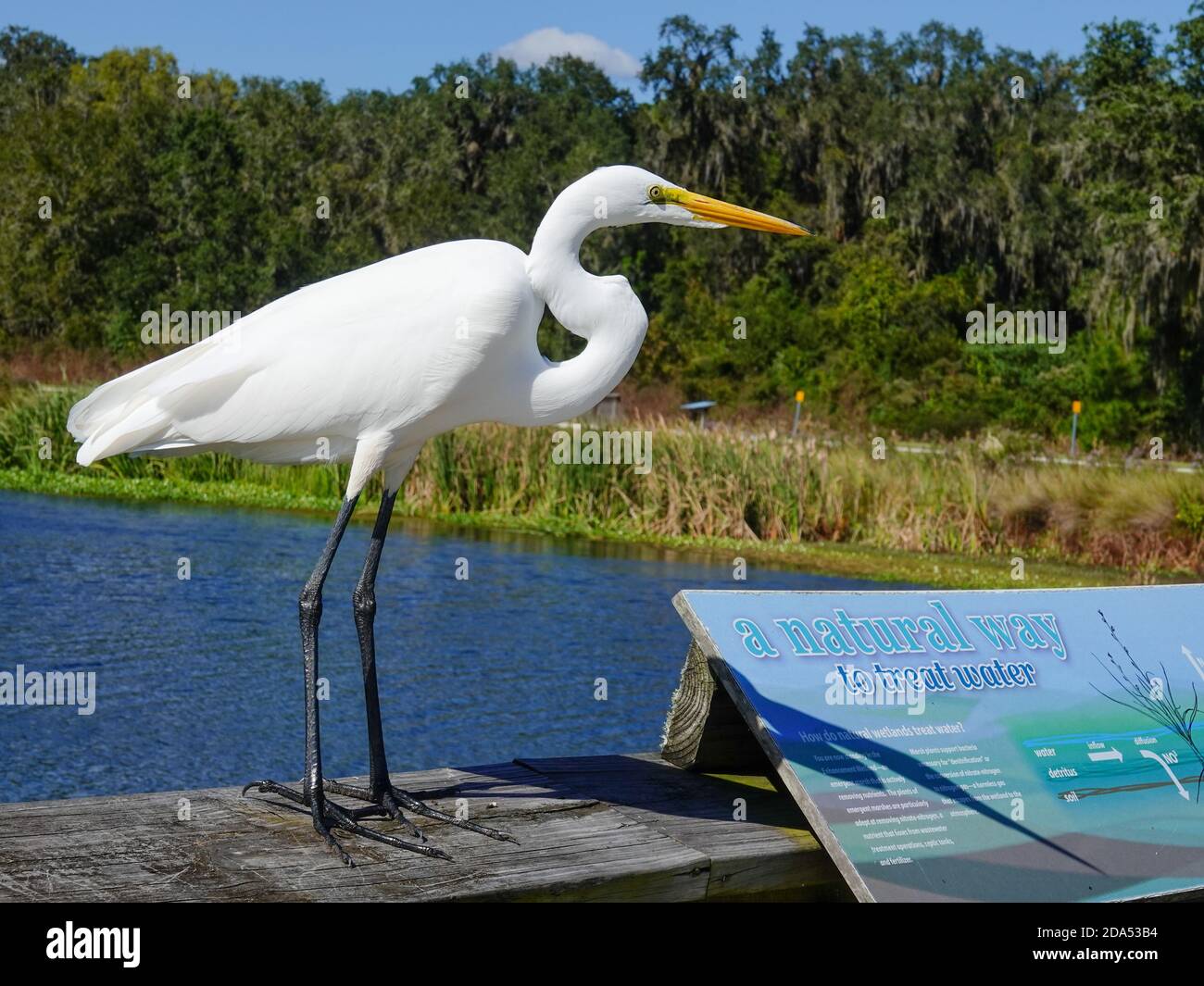 Great egret Ardea alba large white wading bird perched on boardwalk