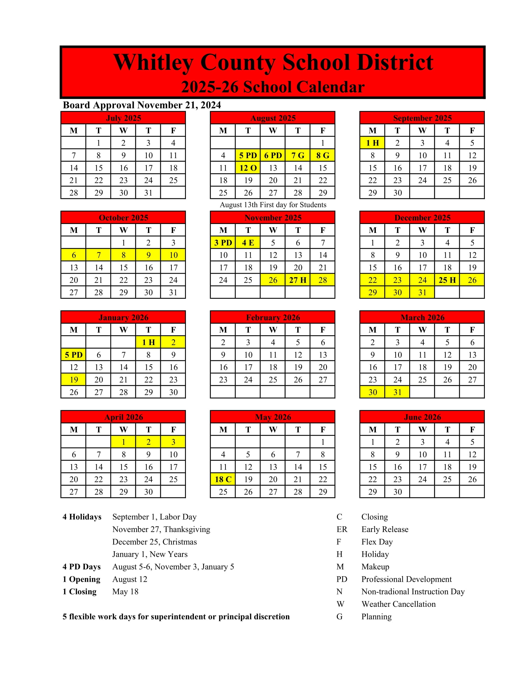 Whitley County School Calendar