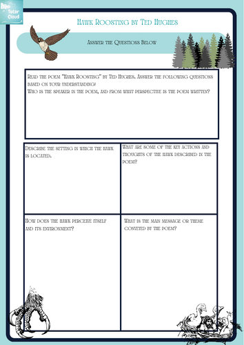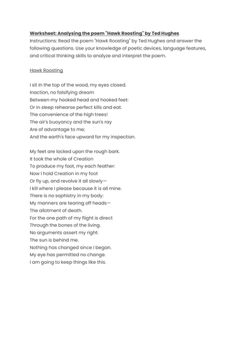 Analysing the poem quot Hawk Roosting quot by Ted Hughes Worksheet Teaching