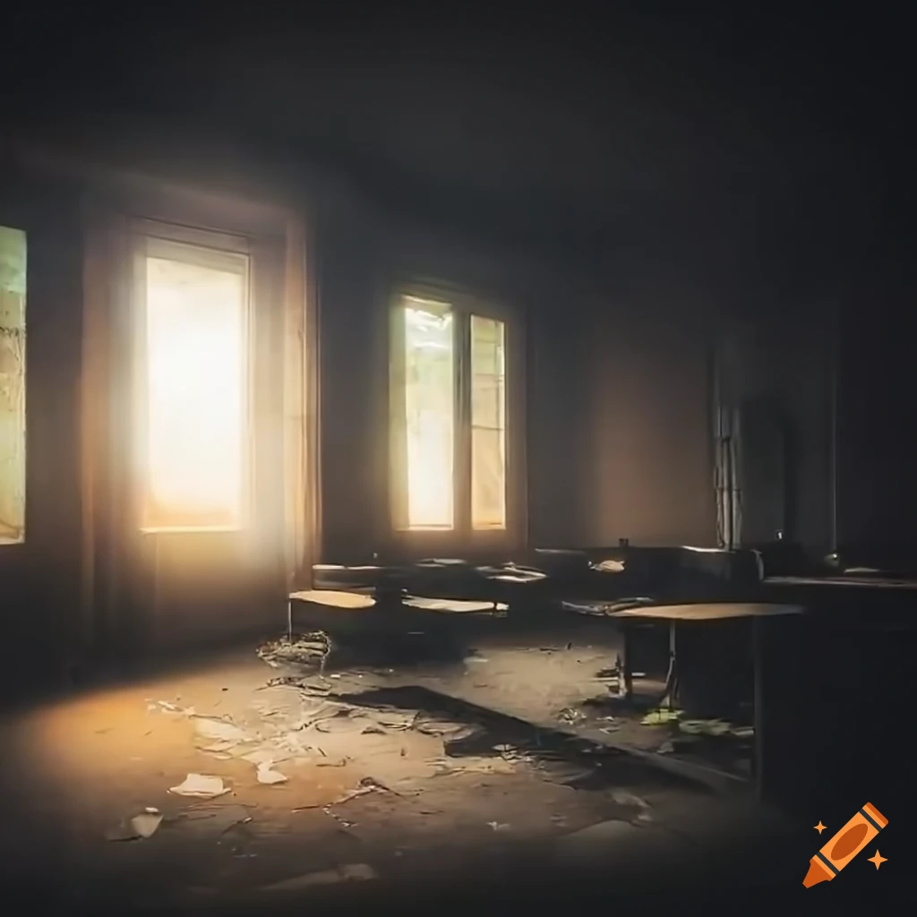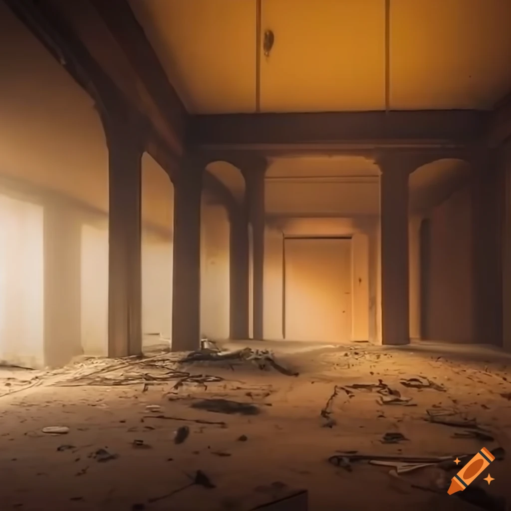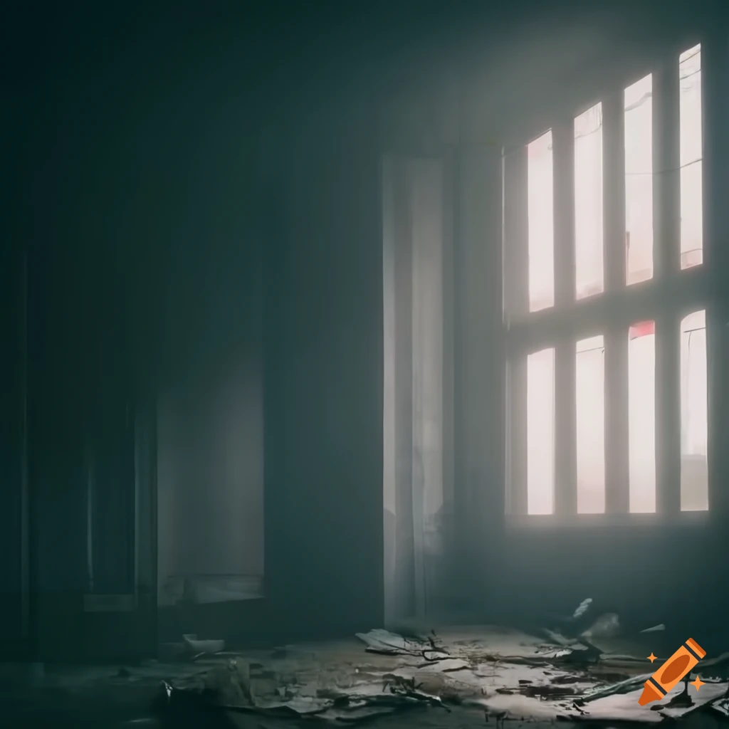 Abandoned conference room in amber fog with industrial windows on Craiyon