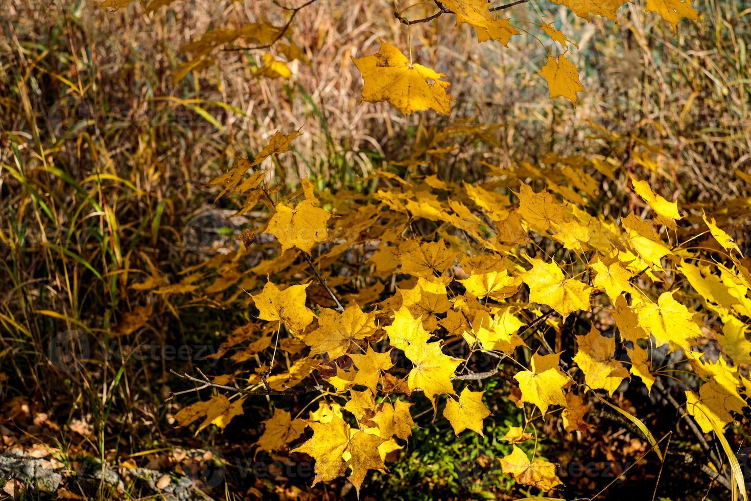 Autumn maple yellow leaves over three Background and sky Maple is the