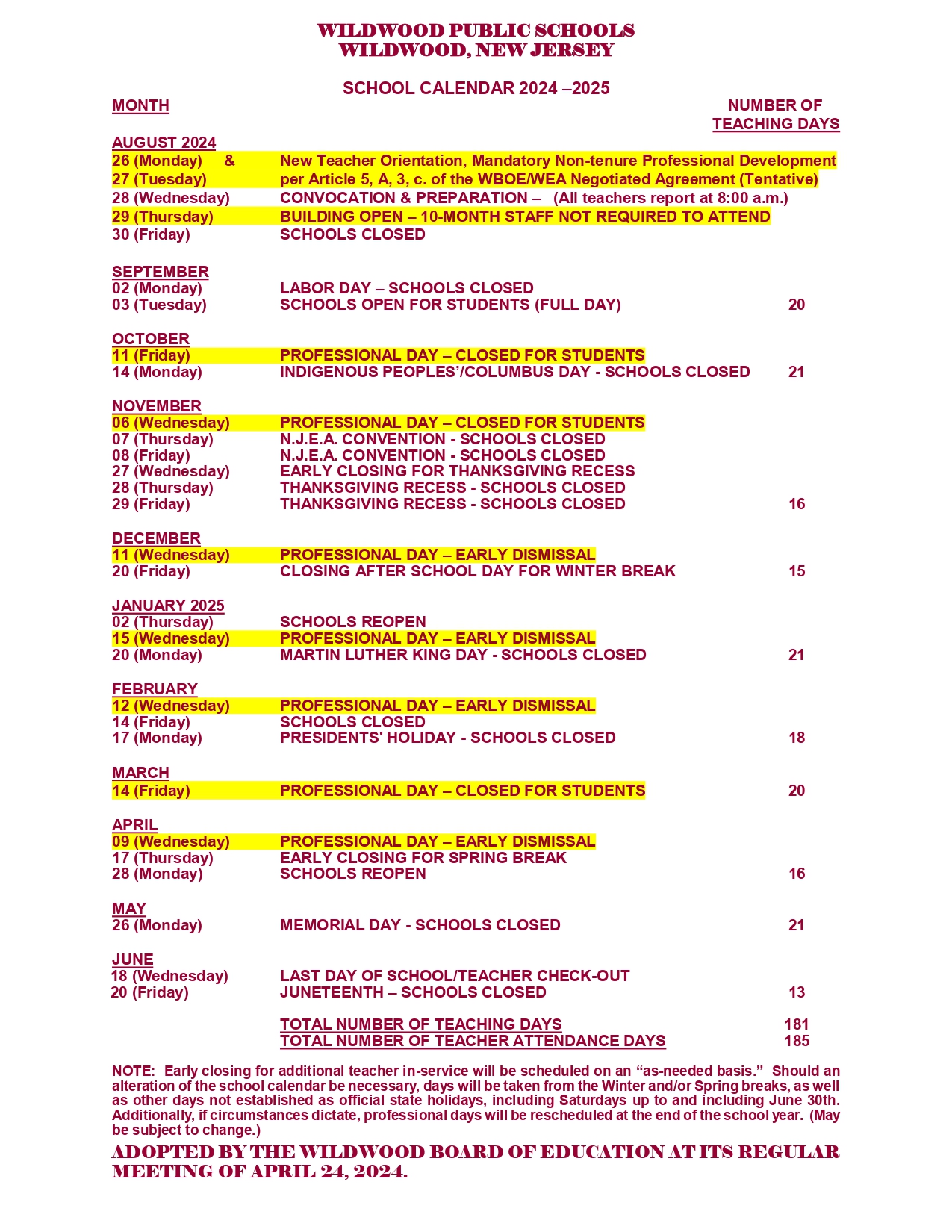 Wildwood Public Schools Calendar 25 26 Revised PDF EduCounty