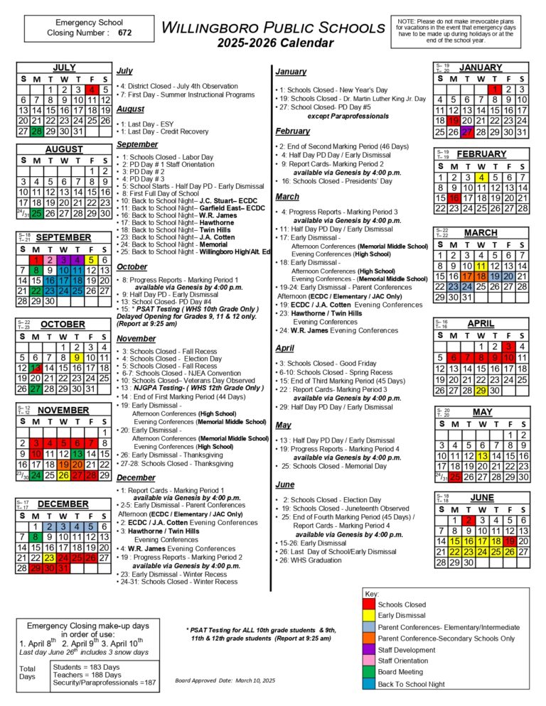 Willingboro Township Public Schools Calendar 25 26 Revised PDF