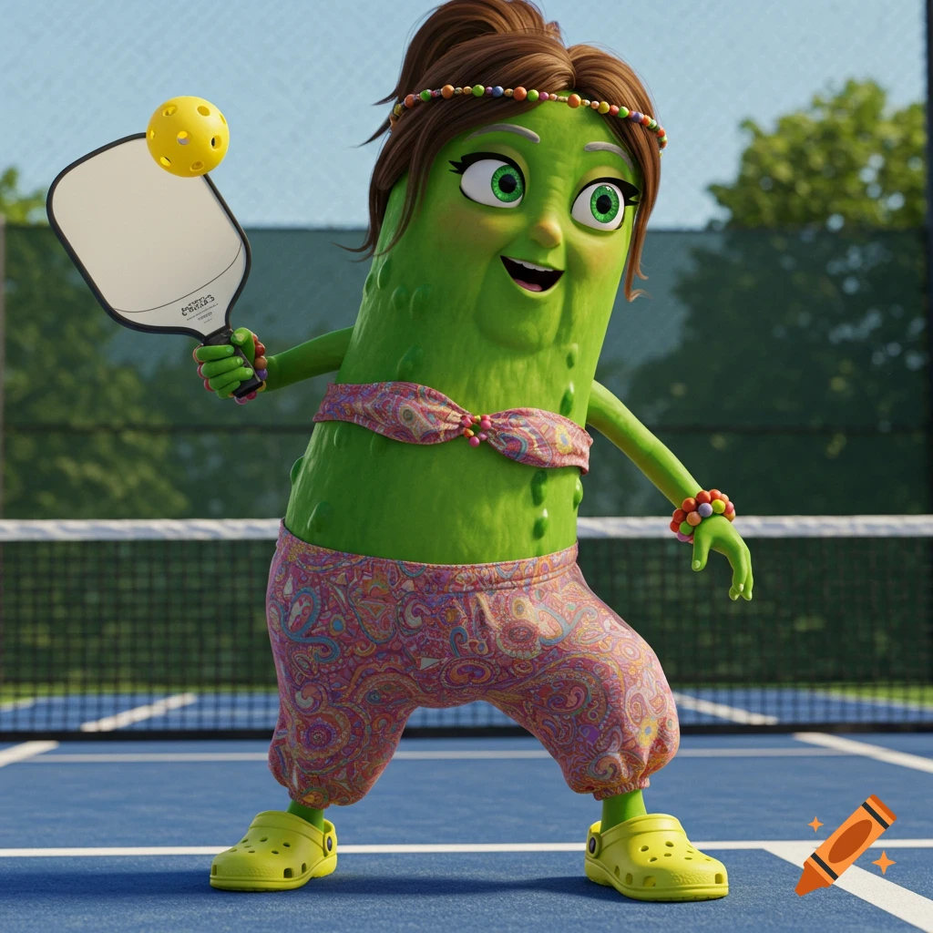 Anthropomorphic pickle woman in guru outfit on pickleball court on Craiyon