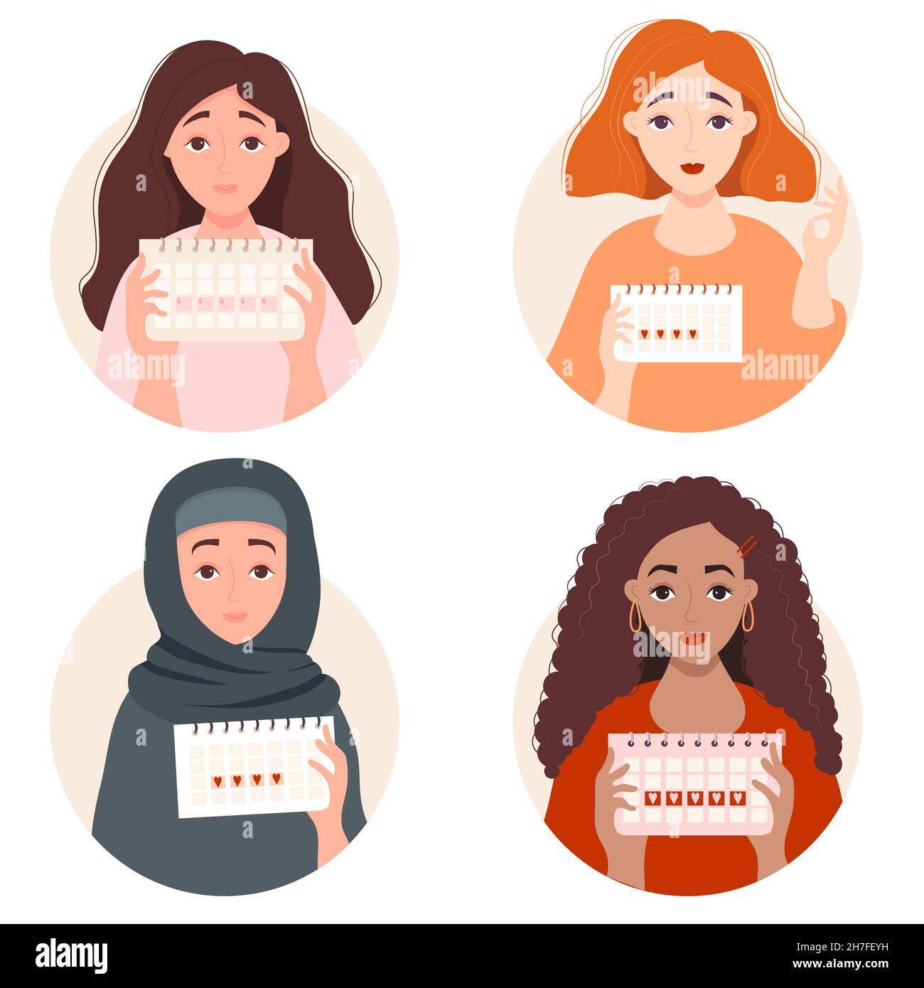 The girl looks at the calendar Set of different ethnic beautiful girls