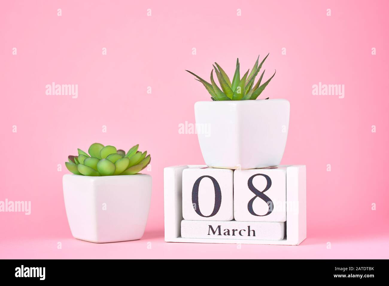 Women #39 s Day concept Wooden calendar block with date 8 march and plant