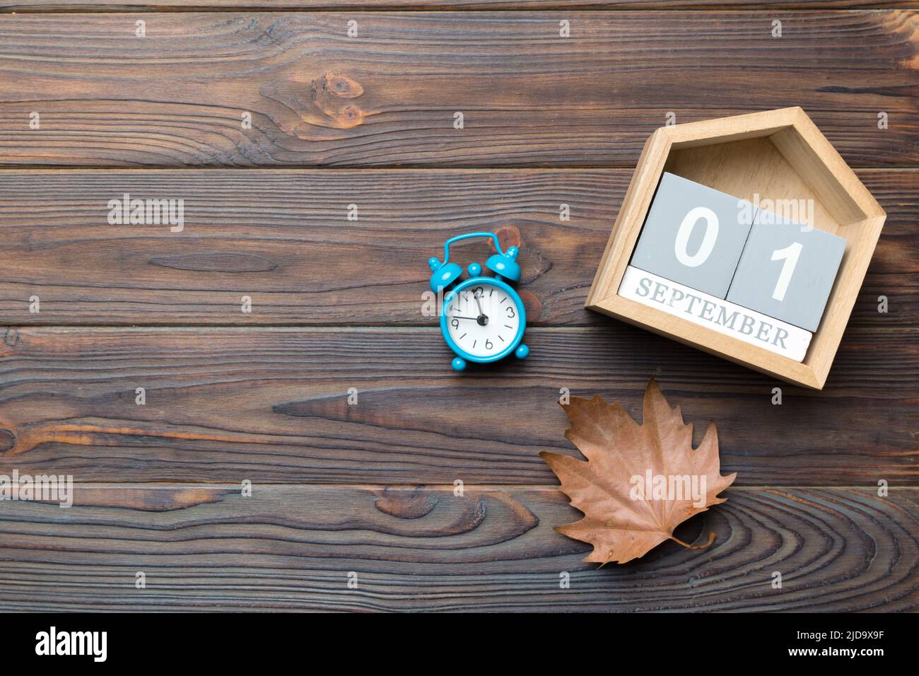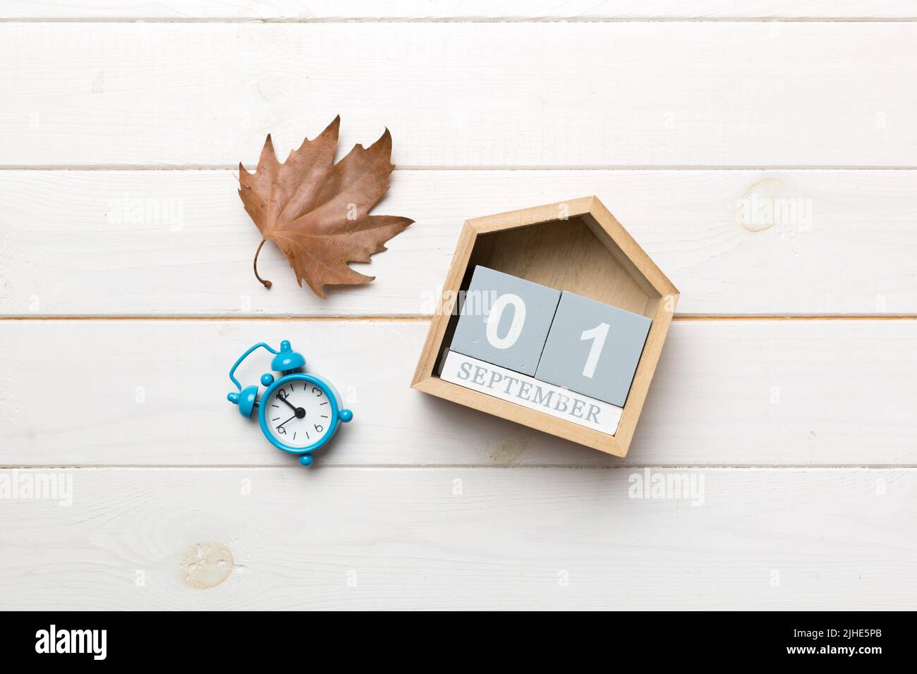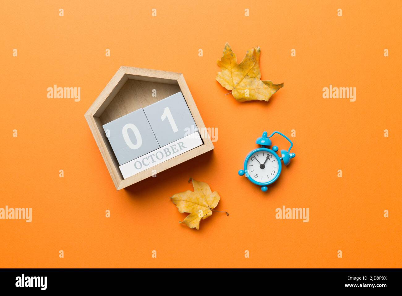 Wooden Calendar Block with Date on Falling Autumn Leaves Background