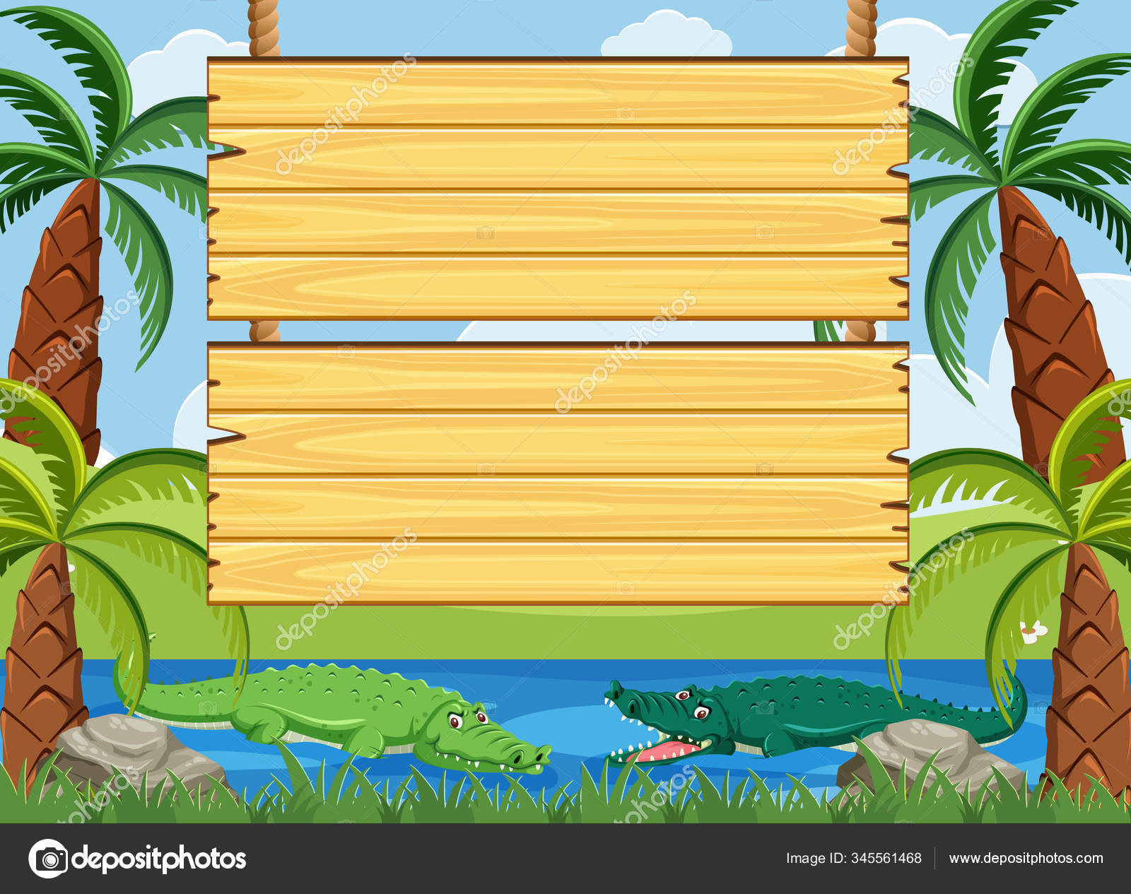 Wooden sign template with crocodile swimming in the river Stock Vector