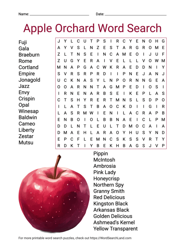 Apple Orchard Word Search Puzzle Worksheet Activity PDF PrintableBazaar